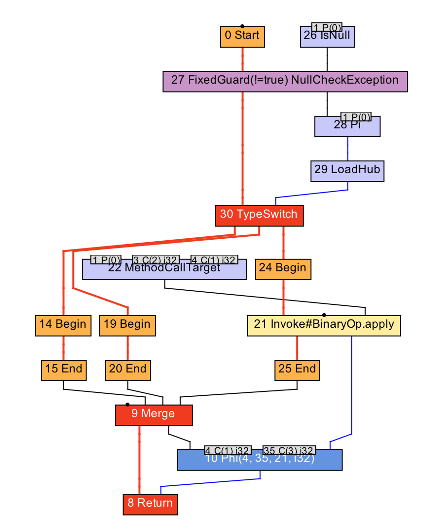 让我们回到原本的例子中。从test方法的IR图可以看出,生成的代码无须检测调用者的动态类型是否为Add,便直接执行内联之后的Add.apply方法中的内容(2+1经过常量折叠之后得到3,对应13号常数节点)。这是因为动态类型检测已被移至假设之中了。