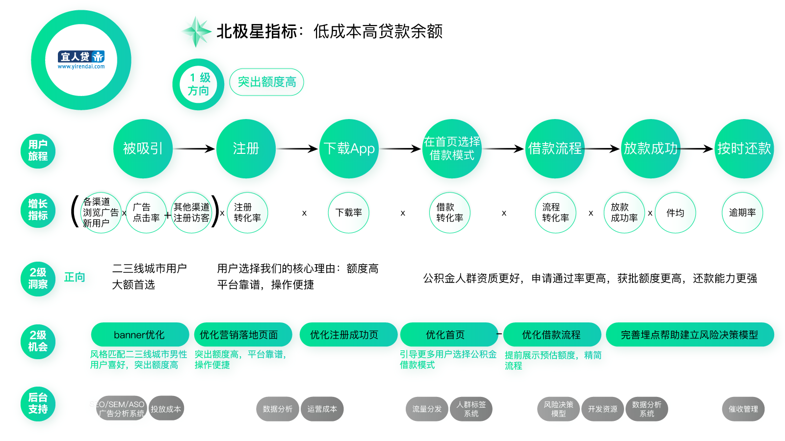 以我在宜人贷的工作为例:一开始我们先从正向入手,明确目标用户人群及产品定位:二三线城市用户大额首选;产品的核心价值:额度高、平台靠谱、操作便捷。这些都是我们通过之前的调研洞察得到的结论。
