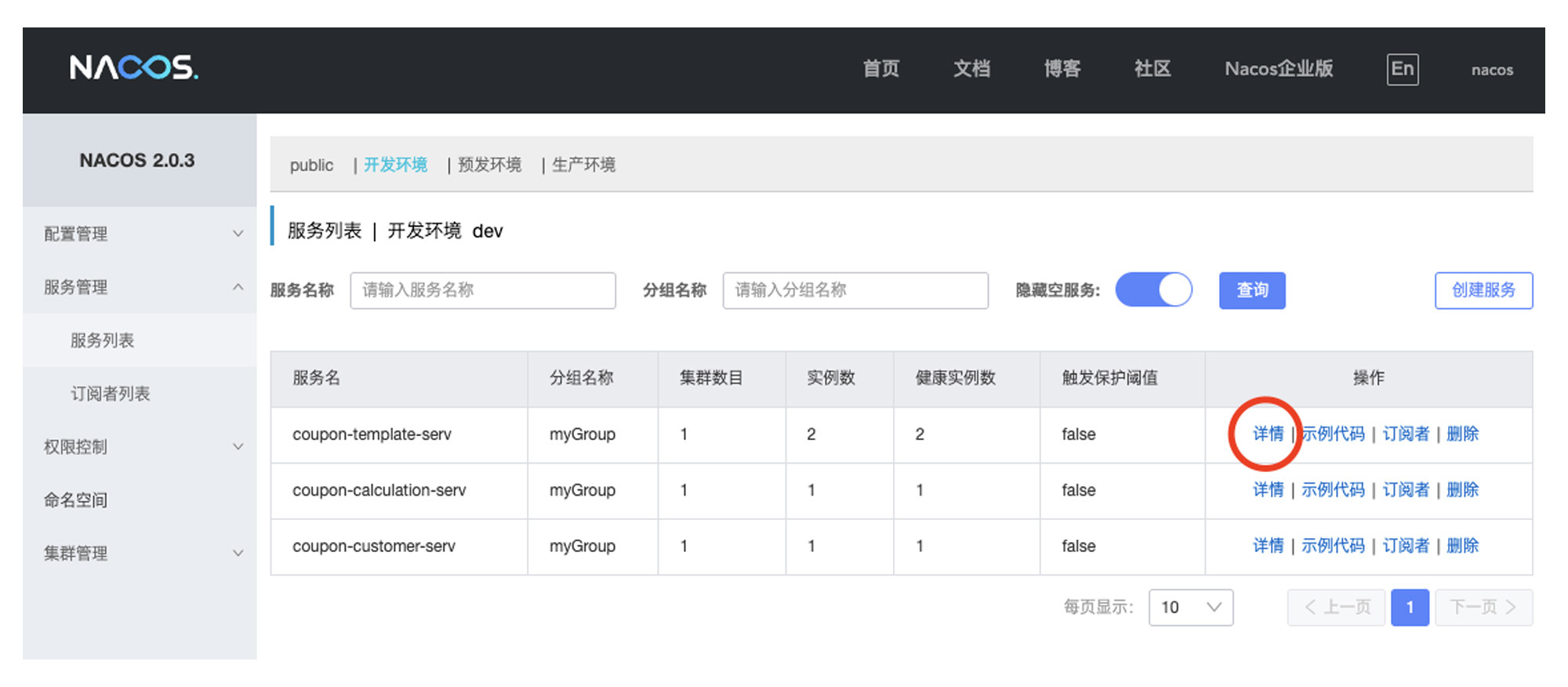 你可以打开Nacos的服务列表页面,点击coupon-template-serv服务右方的“详情”按钮,进入到服务详情页。