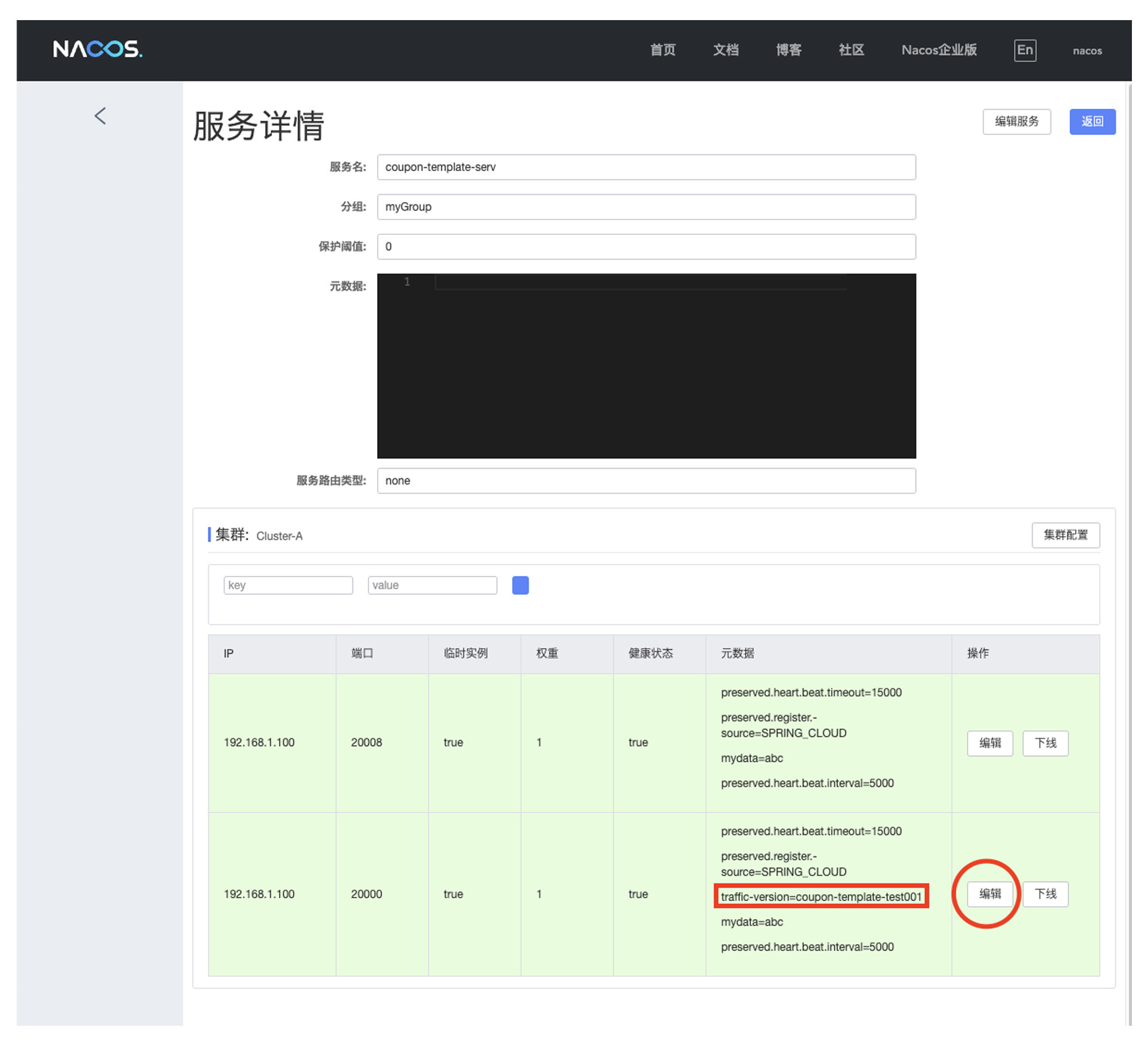 一切配置妥当之后,我们还剩最后一步:借助Nacos元数据将coupon-template-serv标记为一只金丝雀。