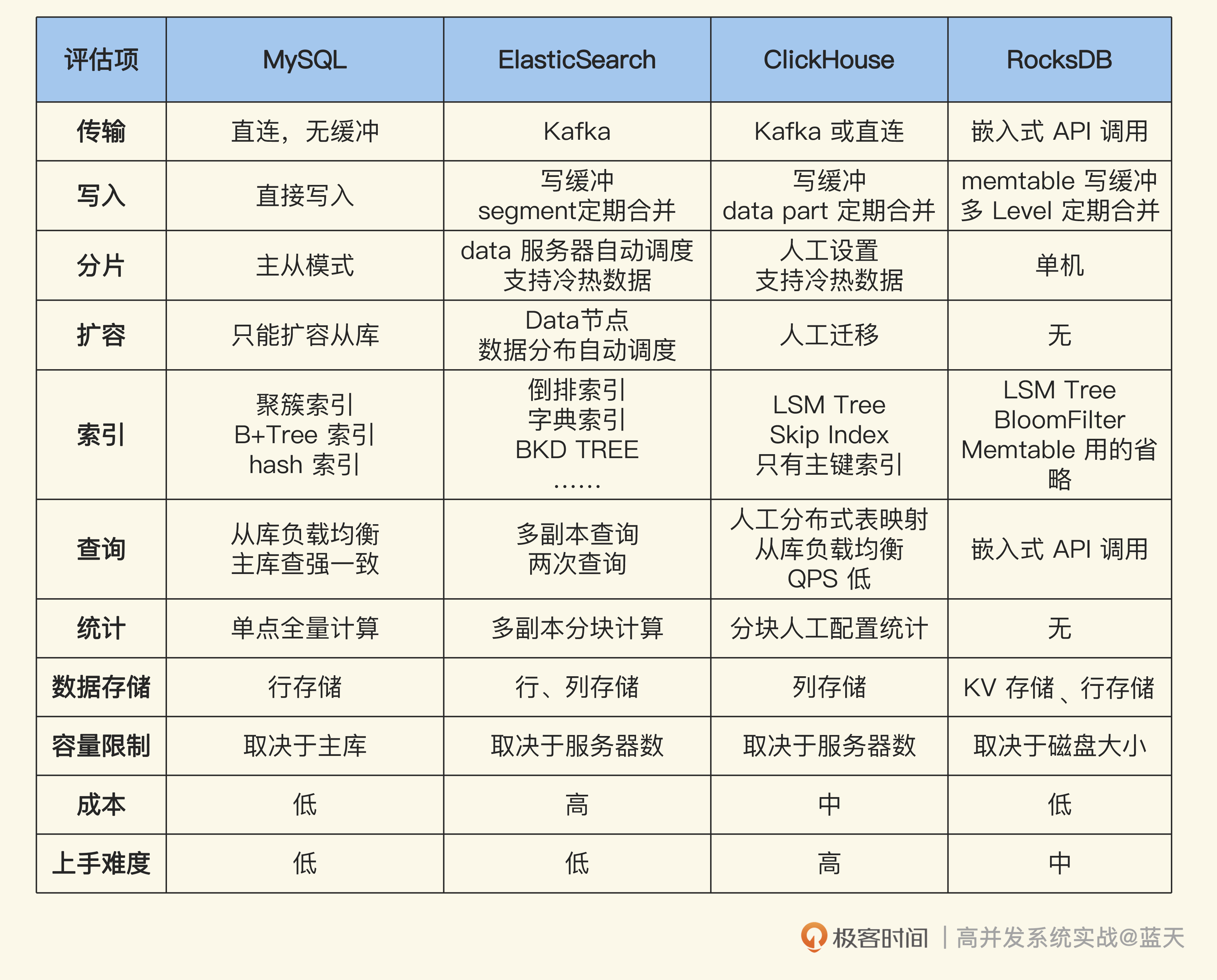 这一章我们详细分析了写多读少系统的几种方案,你会发现它们各有千秋。为了方便你对比学习,我引入了MySQL作为参考。