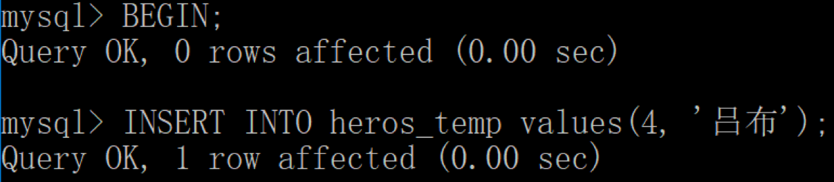 我们在客户端2中开启一个事务,在heros_temp表中写入一个新的英雄“吕布”,注意这个时候不要提交。