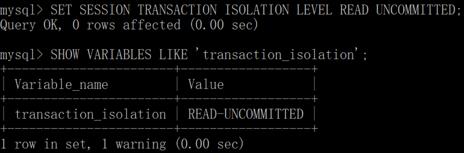 1 | mysql> SET SESSION TRANSACTION ISOLATION LEVEL READ UNCOMMITTED; |