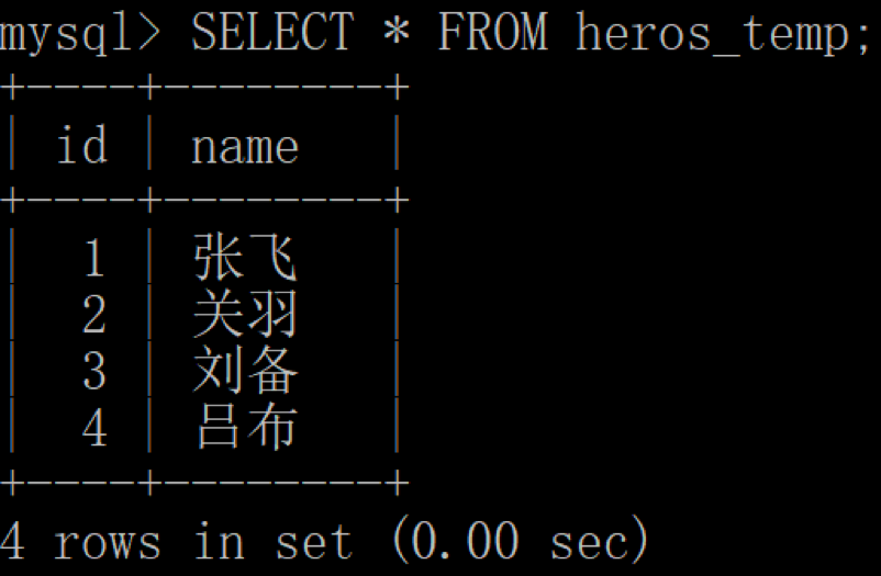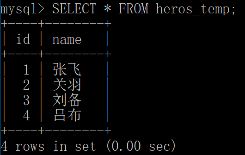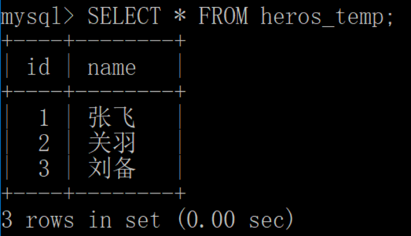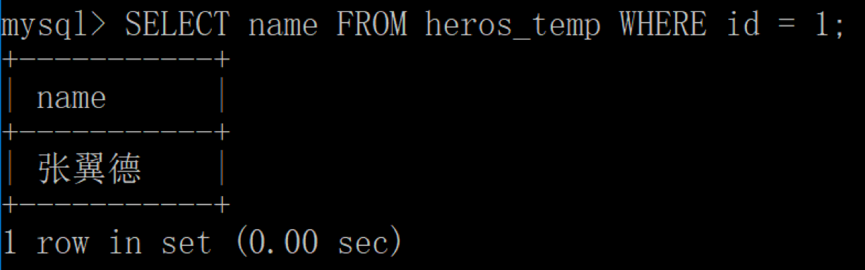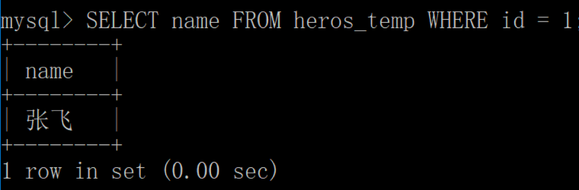 1 | SQL> SELECT name FROM heros_temp WHERE id = 1; |