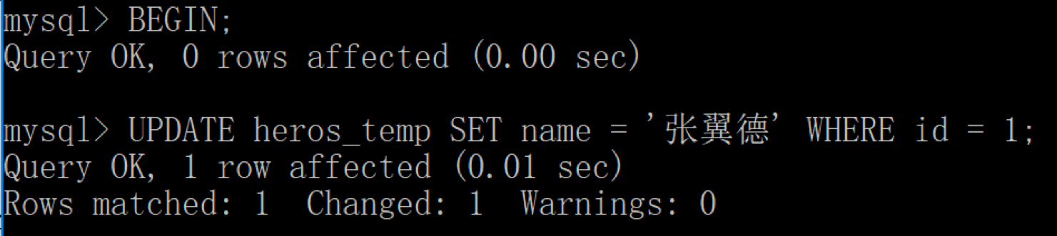 然而此时,小李开始了一个事务操作,他对id=1的英雄姓名进行了修改,把原来的“张飞”改成了“张翼德”:
