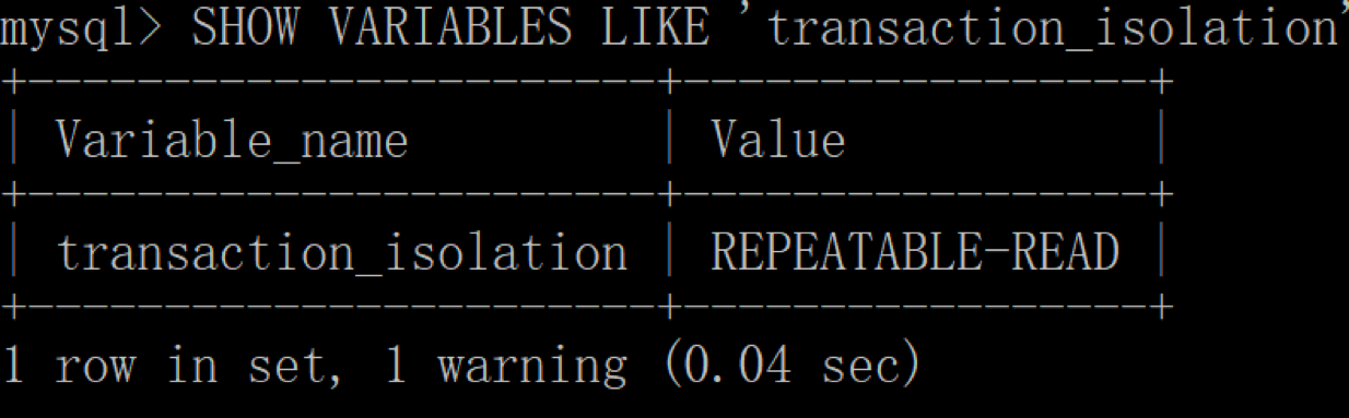 1 | mysql> SHOW VARIABLES LIKE 'transaction_isolation'; |