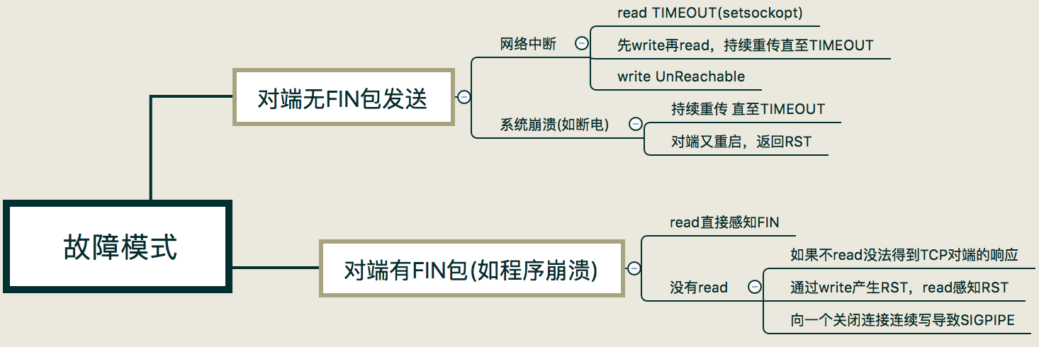 很多原因都会造成网络中断,在这种情况下,TCP程序并不能及时感知到异常信息。除非网络中的其他设备,如路由器发出一条ICMP报文,说明目的网络或主机不可达,这个时候通过read或write调用就会返回Unreachable的错误。