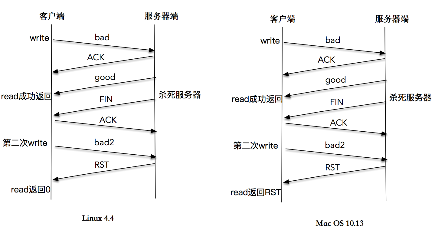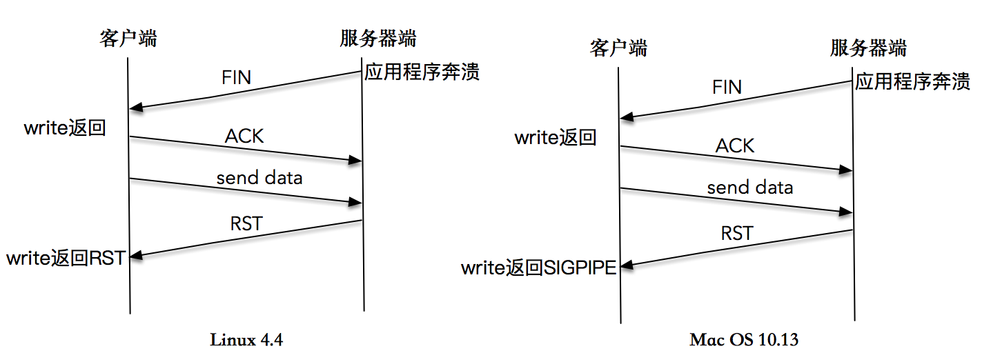 当数据到达服务器端时,操作系统内核发现这是一个指向关闭的套接字,会再次向客户端发送一个RST包,对于发送端而言如果此时再执行write操作,立即会返回一个RST错误信息。