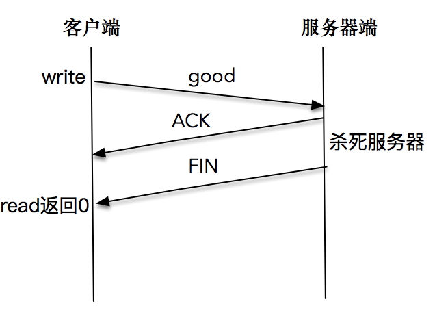 这是因为服务端程序被杀死之后,操作系统内核会做一些清理的事情,为这个套接字发送一个FIN包,但是,客户端在收到FIN包之后,没有read操作,还是会继续往这个套接字写入数据。这是因为根据TCP协议,连接是双向的,收到对方的FIN包只意味着对方不会再发送任何消息。 在一个双方正常关闭的流程中,收到FIN包的一端将剩余数据发送给对面(通过一次或多次write),然后关闭套接字。