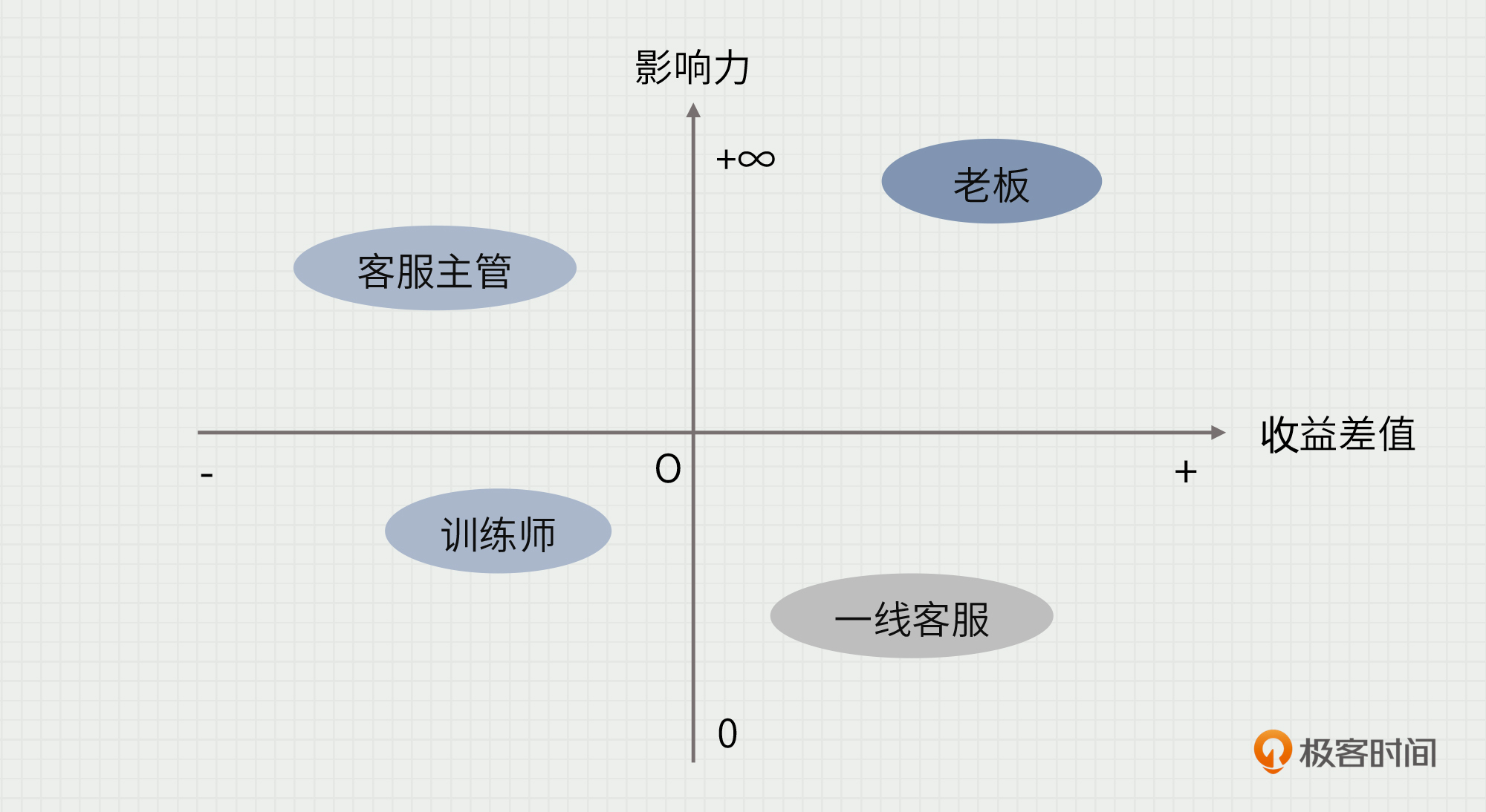 客服主管:影响力也不小。他可以影响老板对 AI 客服机器人的评价,但目前的产品并没有给他带来收益。在购入了AI客服机器人这个产品之后,原客服团队的人数可能要下降,他在公司里的地位和话语权也会随之下降,此外,原来对人工客服的考核模式在新的情况下也不适用了,因此他的收益为负。他在左上角。