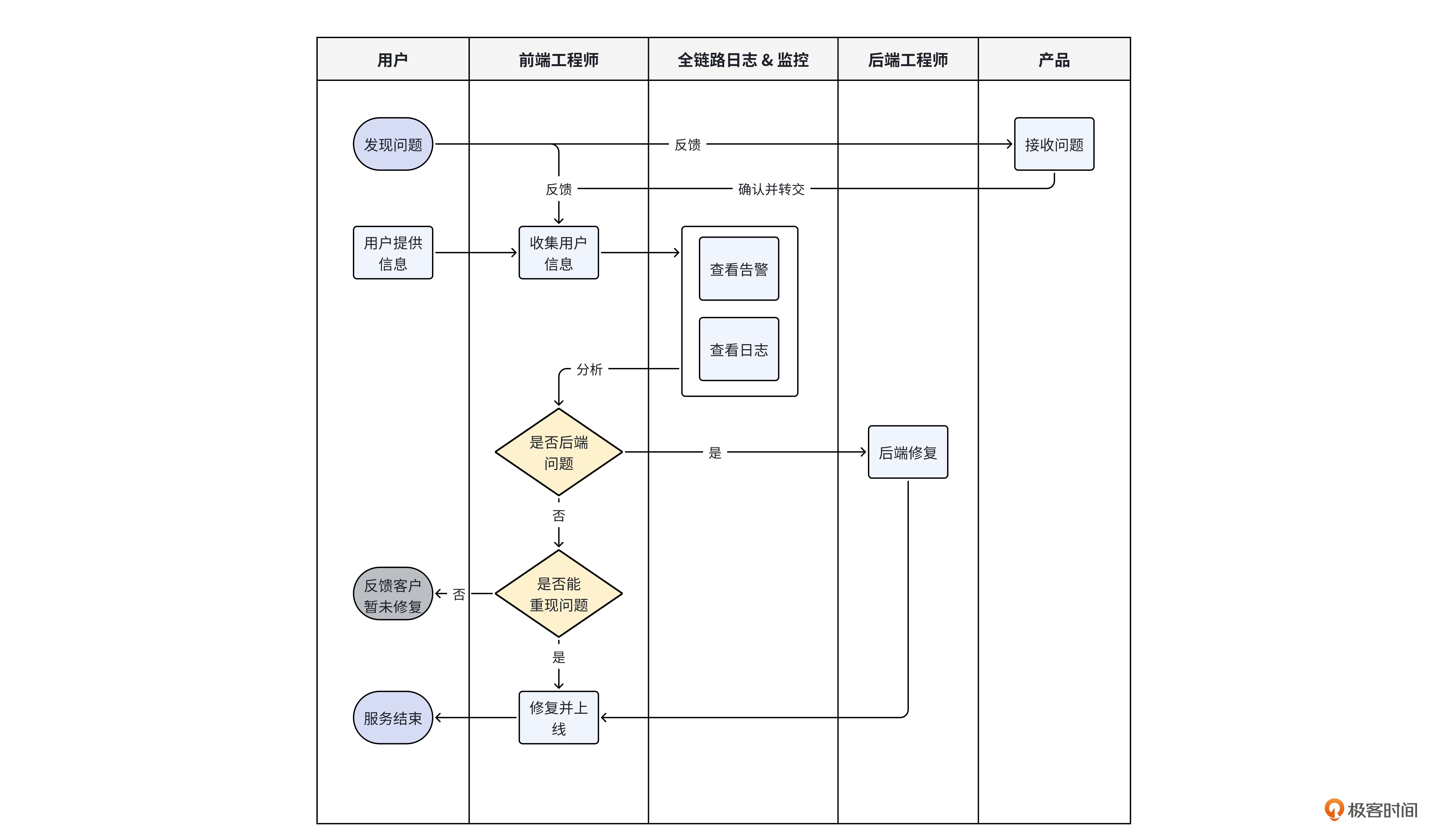 如果不是通用问题,那就再通过用户提供的信息(如用户ID、时间范围)查询该用户的全链路关联日志,比如前端脚本报错日志、前端请求接口日志、业务配置是否合理等等。