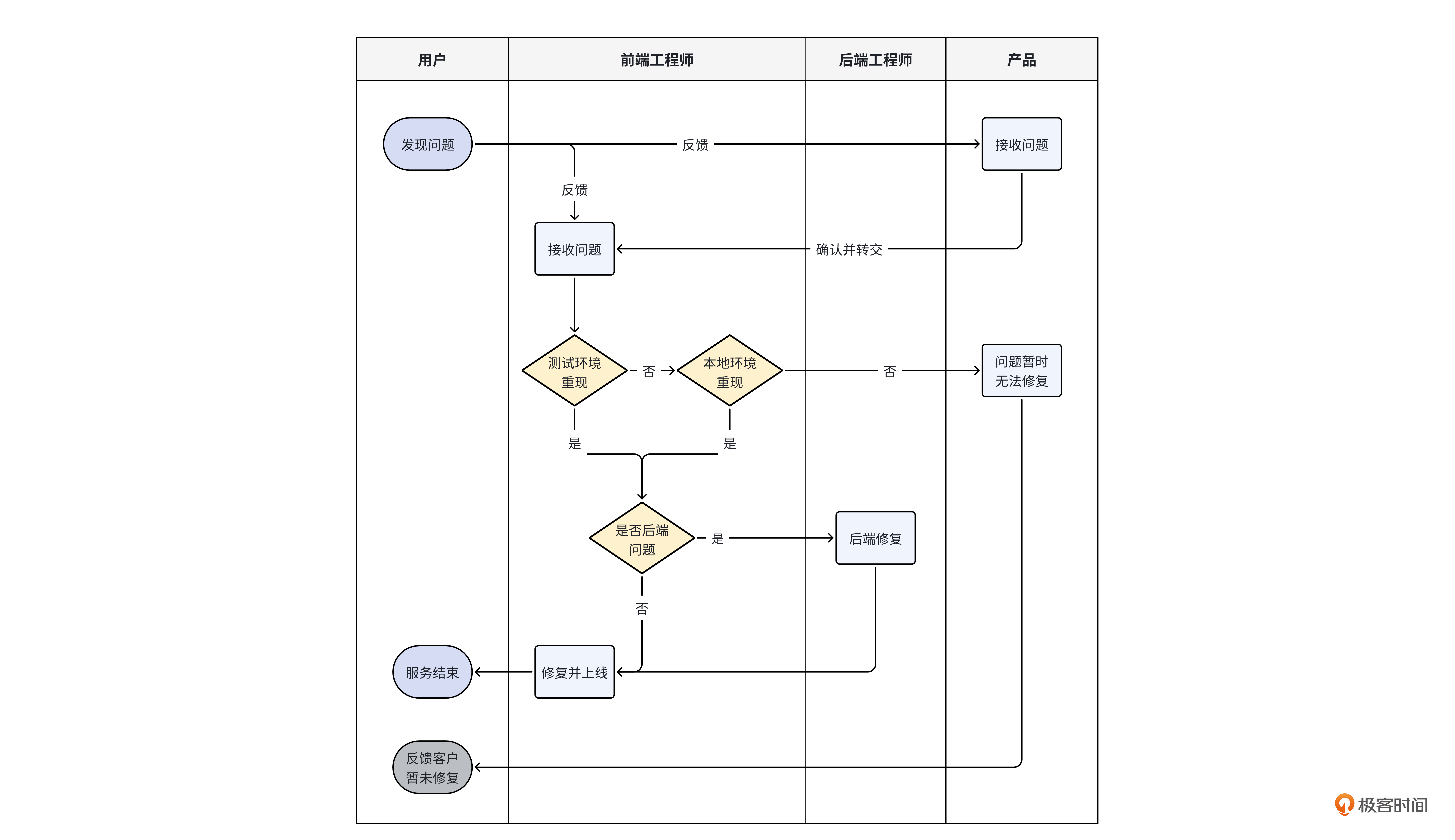 这节课,我从两个不同角度描述了产品出现缺陷时,用户和程序员的关注点。用户希望了解问题的起因以及何时能解决他们的困扰。而程序员在面对用户最棘手问题的时候,需要做到快速定位问题根源,并给出明确的问题修复时间。