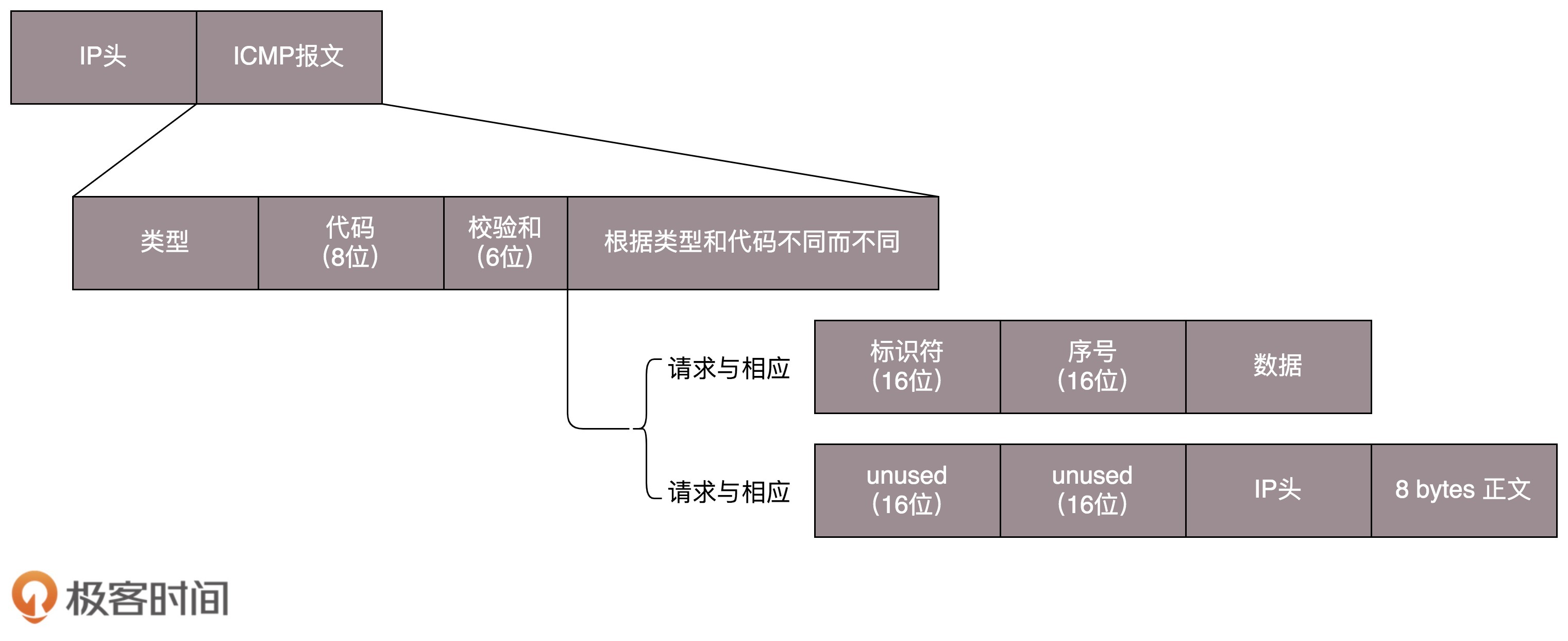 ICMP报文是封装在IP包里面的。因为传输指令的时候,肯定需要源地址和目标地址。它本身非常简单。因为作为侦查兵,要轻装上阵,不能携带大量的包袱。