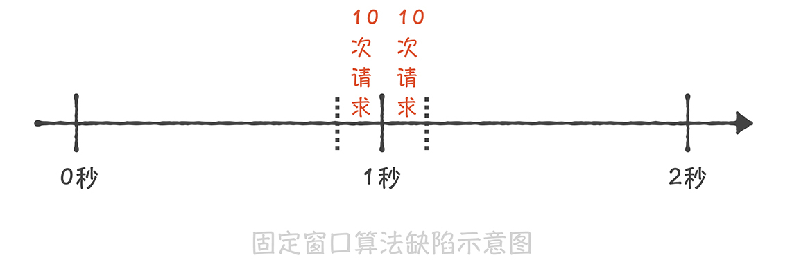 这种算法虽然实现非常简单,但是却有一个很大的缺陷 :无法限制短时间之内的集中流量。假如我们需要限制每秒钟只能处理10次请求,如果前一秒钟产生了10次请求,这10次请求全部集中在最后的10毫秒中,而下一秒钟的前10毫秒也产生了10次请求,那么在这20毫秒中就产生了20次请求,超过了限流的阈值。但是因为这20次请求分布在两个时间窗口内,所以没有触发限流,这就造成了限流的策略并没有生效。