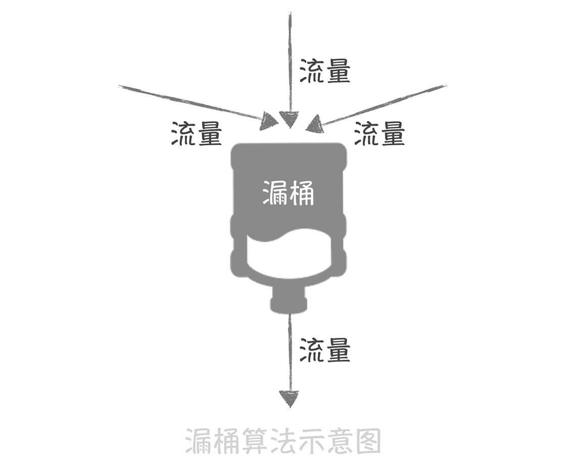 漏桶算法的原理很简单,它就像在流量产生端和接收端之间增加一个漏桶,流量会进入和暂存到漏桶里面,而漏桶的出口处会按照一个固定的速率将流量漏出到接收端(也就是服务接口)。