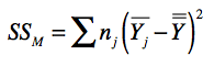 在这个公式中, $Y_{ij}$如前所说,表示了第$i$天第$j$种算法所导致的转化率。而$\overline{\overline Y}$表示了10天里,2种算法全部20个数据的平均值。SSM表示数据分布所引起的方差,我们称它为模型平方和(Sum Of Squares for Model),它的计算公式如下: