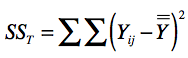 在这个公式中,$n_{j}$为水平$j$下的观测数量,在我们的案例中为10。$\overline Y_{j}$为第$j$个水平的平均值,在案例中为算法a或算法b在这10天的平均值。$\overline Y_{j}-\overline{\overline Y}$表示的是某个算法的采样均值和所有采样均值之间的差异,$n_{j}$是相应的权重。我们这里的两个算法都被测试了10天,所以权重相同。根据我们的案例,SSM是0.00018。SSE表示采样引起的方差,我们称它为误差平方和(Sum of Squaress for Error)。它的计算公式如下: