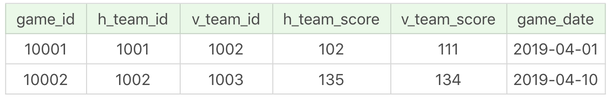 team_score表为球队比赛成绩表,一共记录了两场比赛的成绩,如下所示: