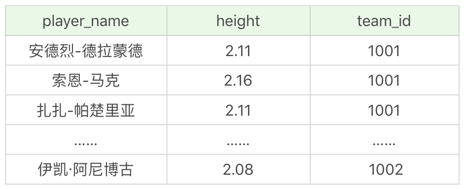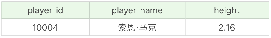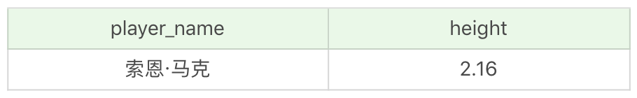 你能看到,通过SELECT max(height) FROM player可以得到最高身高这个数值,结果为2.16,然后我们再通过player这个表,看谁具有这个身高,再进行输出,这样的子查询就是非关联子查询。
