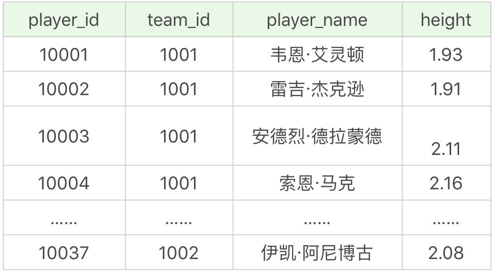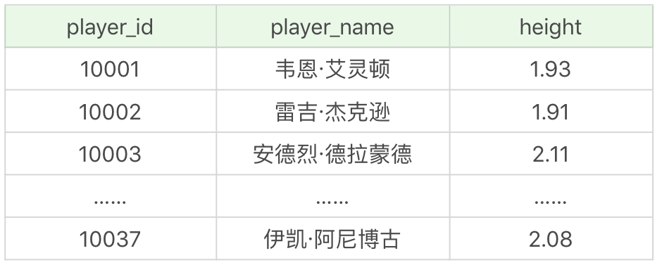 如果我们想要查询球员表中,比印第安纳步行者(对应的team_id为1002)中任意一个球员身高高的球员信息,并且输出他们的球员ID、球员姓名和球员身高,该怎么写呢?首先我们需要找出所有印第安纳步行者队中的球员身高,即SELECT height FROM player WHERE team_id = 1002,然后使用ANY子查询即: