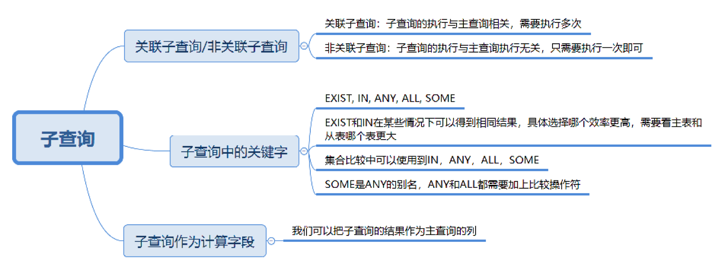 - 子查询中有一些关键词,可以方便我们对子查询的结果进行比较。比如存在性检测子查询,也就是EXISTS子查询,以及集合比较子查询,其中集合比较子查询关键词有IN、SOME、 ANY和ALL,这些关键词在子查询中的作用是什么;