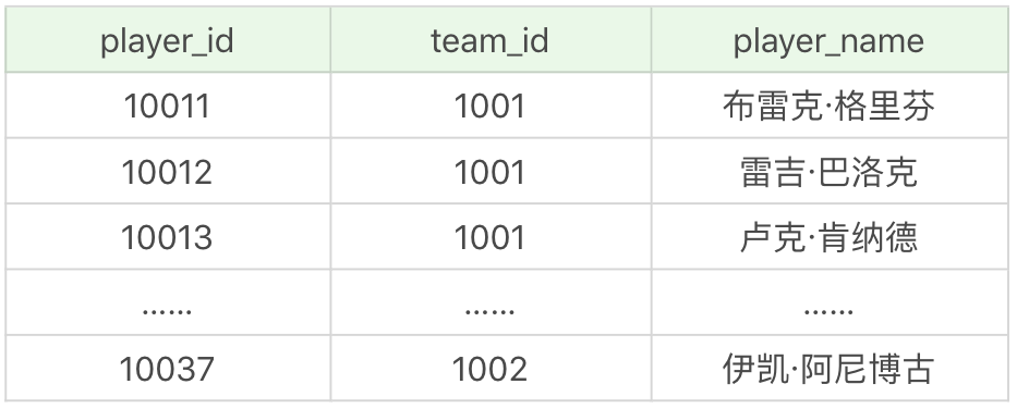 其中player表,也就是球员表,一共有37个球员,如下所示: