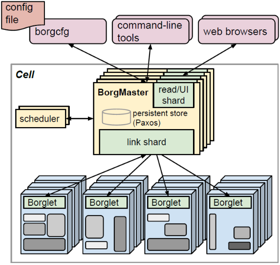 Scheduler负责任务的调度,当用户提交一个作业给BorgMaster后,BorgMaster会把该作业保存到Paxos仓库中,并将这个作业的所有任务加入等待队列中。调度器扫描任务等待队列,根据预定义的调度算法,将队列中的任务分配到满足作业需求且有足够资源的计算节点上(也即上上图所示的Borglet节点)。