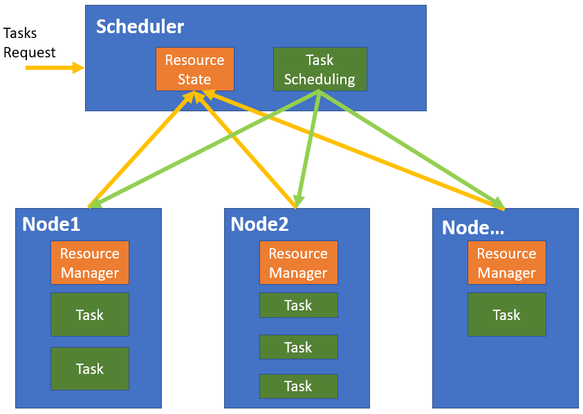 每个节点都有本地的资源管理模块“Resource Manager”,上报节点资源信息,并接收来自中央调度器下发的任务。