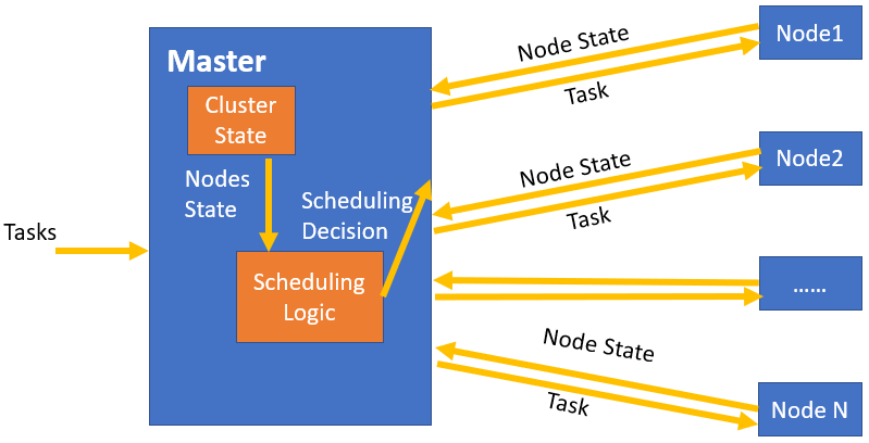 在单体调度框架中,多个Node节点会将本节点的State(例如,资源信息等)上报给Master节点。Master节点将Nodes State信息记录在Cluster State模块,Cluster State模块用于管理集群中节点的资源等状态。Master节点中的Scheduling Logic模块用于进行Tasks与节点资源的匹配。当Master需要下发任务时,Cluster State模块会将节点的资源状态传送给Scheduling Logic模块,以便Scheduling Logic模块进行Tasks与资源匹配,并根据匹配结果将Task发送给匹配到的节点。