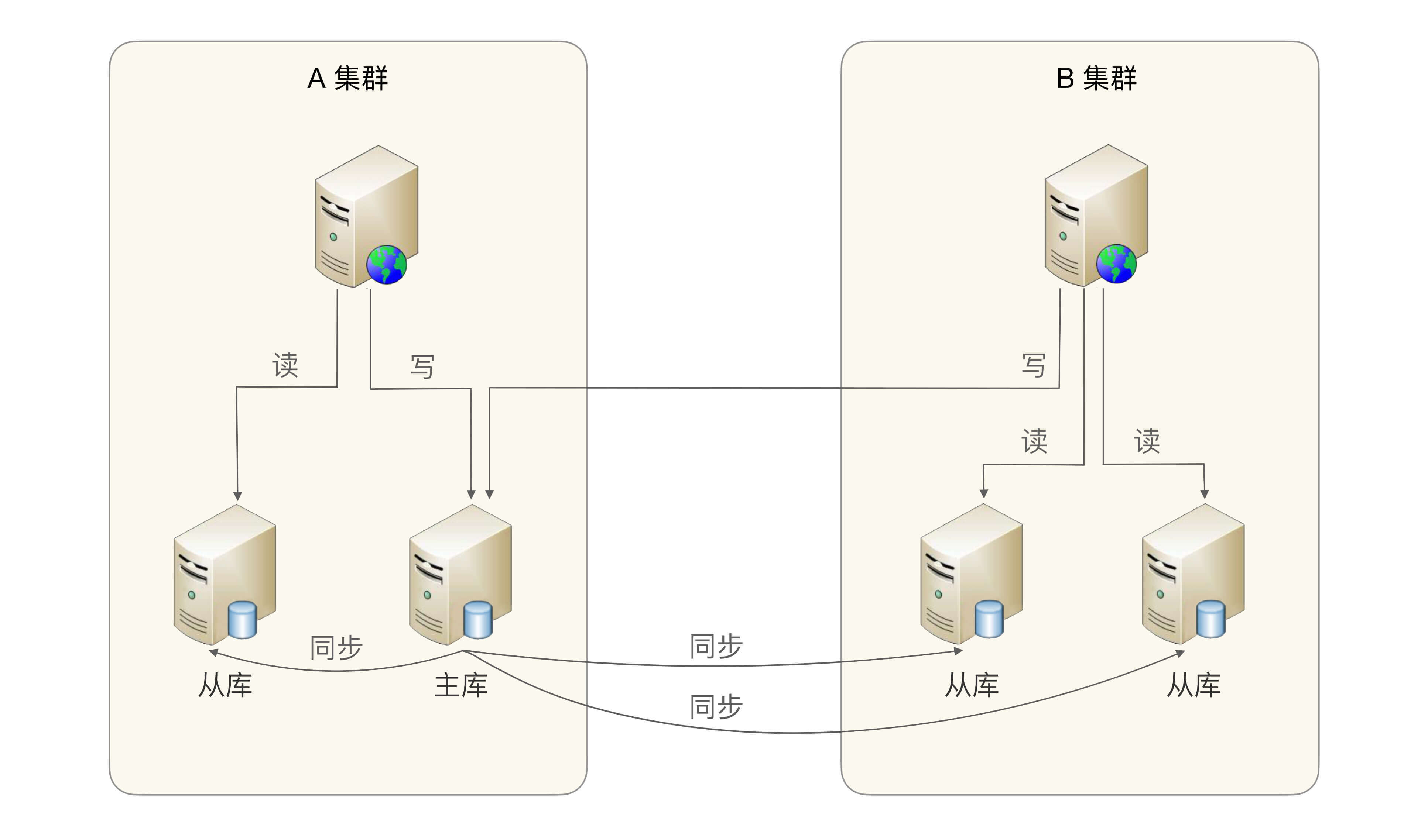 S系统是游戏接入的核心系统,一旦S系统故障,大量游戏玩家就不能登录游戏。而S系统并不具备多中心的能力,一旦主机房宕机,整个S系统业务就不可用了。其大概架构如下图所示,可以看出数据库主库是全局单点,一旦数据库主库不可用,两个集群的写业务都不可用了。