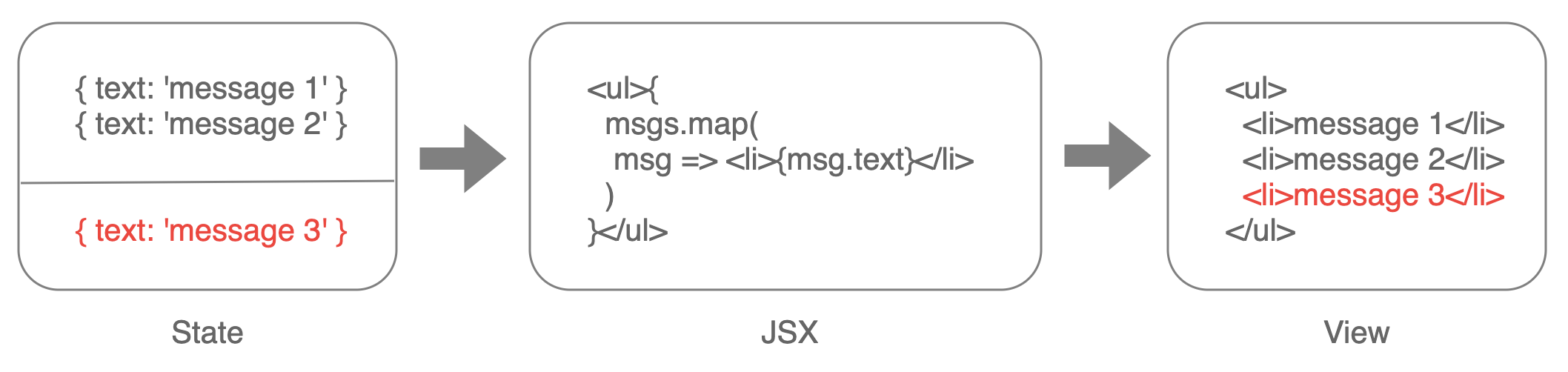 可以看到,我们可以通过 JSX 语法,用声明式的方式来描述数据和 UI 之间的关系,那么数据在发生变化时,UI 也会自动发生变化。这样的话,无论是收到一条还是多条消息,React 都会自动完成 UI 的展现,我们也就不再需要去关心怎么产生变化的细节。那么基于同一个数据,比如我们需要在通知栏里显示消息的数量,那么显示消息数量的组件,只需要绑定到消息的长度上,它也会自动更新,这样很容易就保证 UI 上的一致性了。