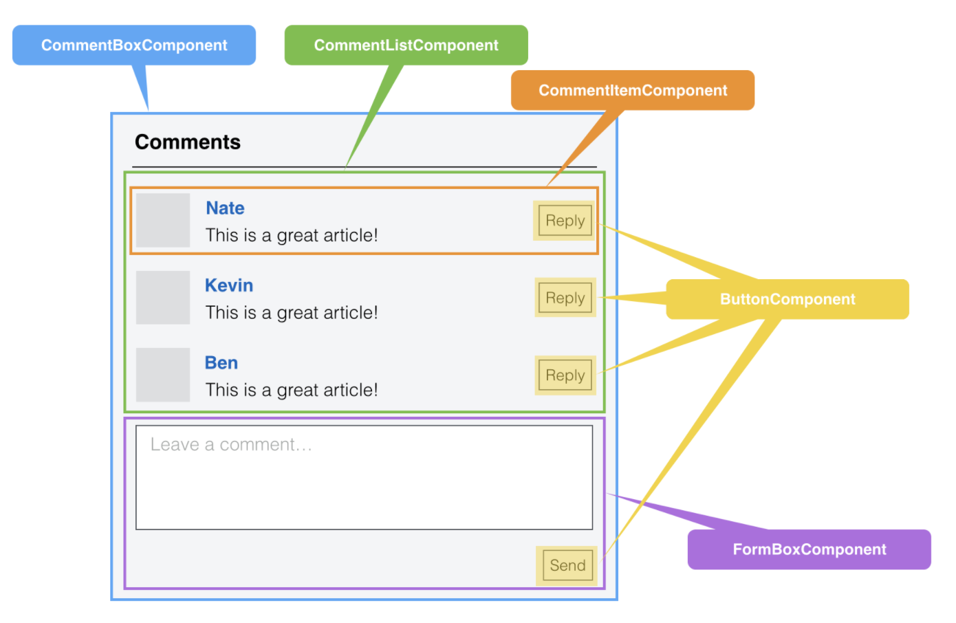 和 DOM 的节点定义类似,React 组件是以树状结构组织到一起的,一个 React 的应用通常只有一个根组件。此外,在实际开发时,我们会把 UI 划分成不同的组件,然后组织到一起,例如对于下面这样一个评论框的 UI: