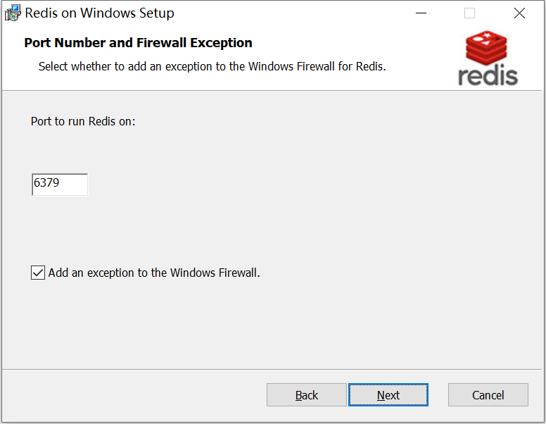 然后点击Next,这时会让你设置Redis的运行端口,在这里我们使用默认值6379即可。但是如果是在生产环境,我建议你换一个端口,防止被黑客攻击。同样,我们勾选“添加防火墙例外”,然后点击Next,如图所示。