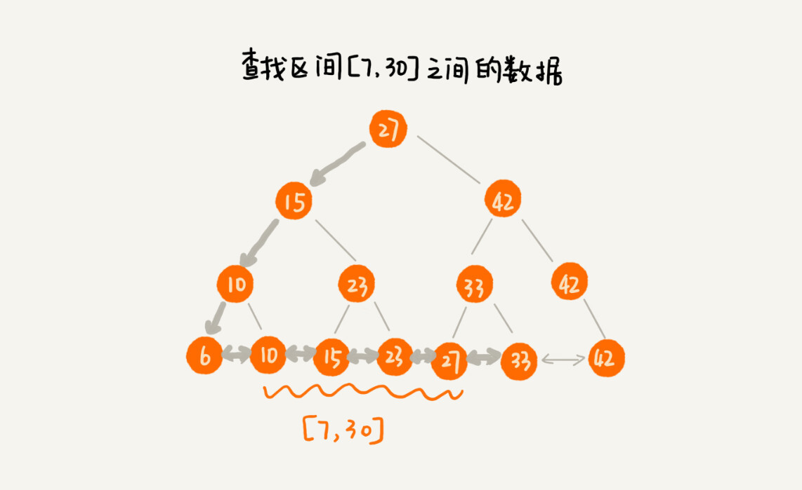 改造之后,如果我们要求某个区间的数据。我们只需要拿区间的起始值,在树中进行查找,当查找到某个叶子节点之后,我们再顺着链表往后遍历,直到链表中的结点数据值大于区间的终止值为止。所有遍历到的数据,就是符合区间值的所有数据。