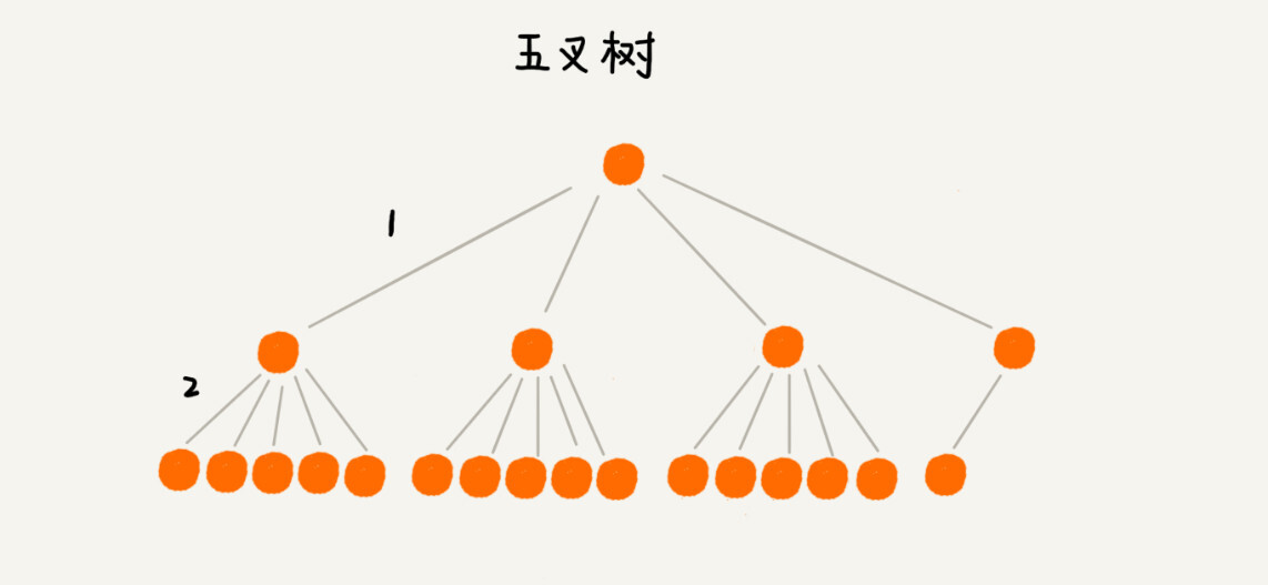 我们来看下,如果我们把索引构建成m叉树,高度是不是比二叉树要小呢?如图所示,给16个数据构建二叉树索引,树的高度是4,查找一个数据,就需要4个磁盘IO操作(如果根节点存储在内存中,其他节点存储在磁盘中),如果对16个数据构建五叉树索引,那高度只有2,查找一个数据,对应只需要2次磁盘操作。如果m叉树中的m是100,那对一亿个数据构建索引,树的高度也只是3,最多只要3次磁盘IO就能获取到数据。磁盘IO变少了,查找数据的效率也就提高了。