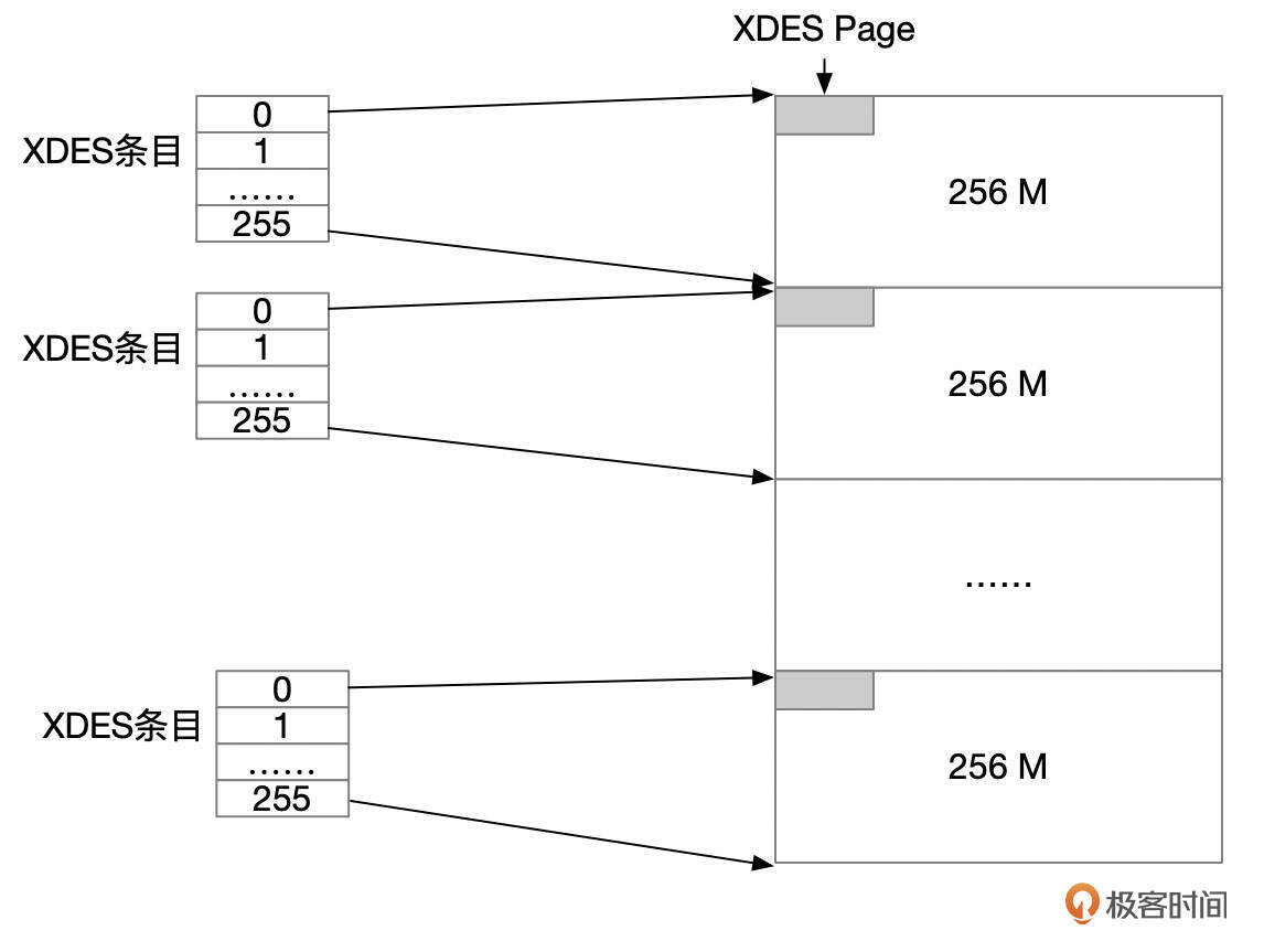 FSP HEADER中,存储了256个区描述符,可以管理256M空间。如果数据文件超过256M,则每256M的第一个页面都会用来存储区描述符。
