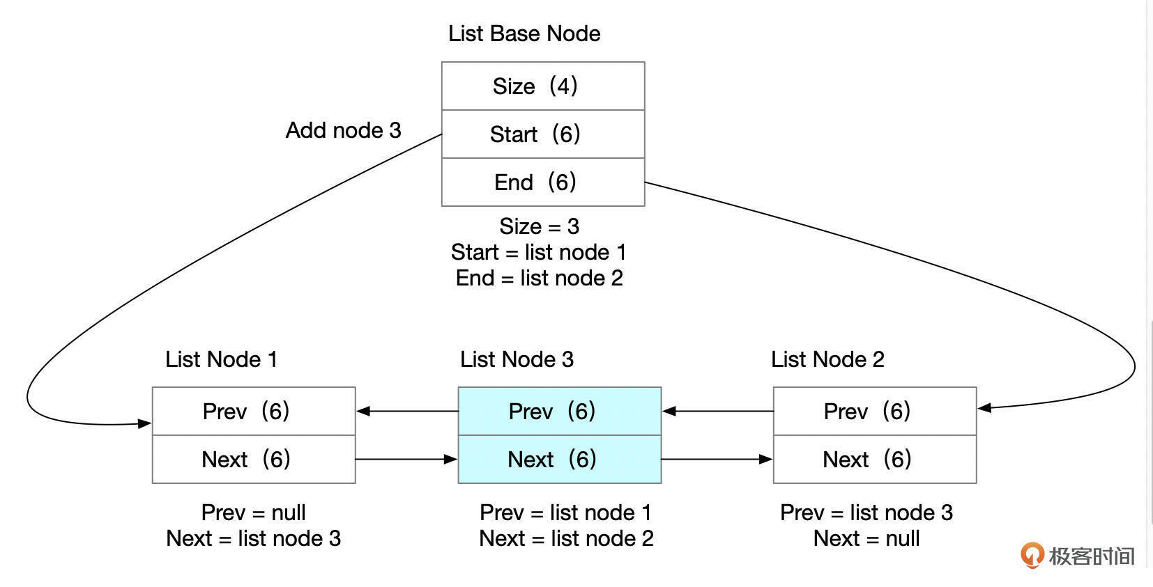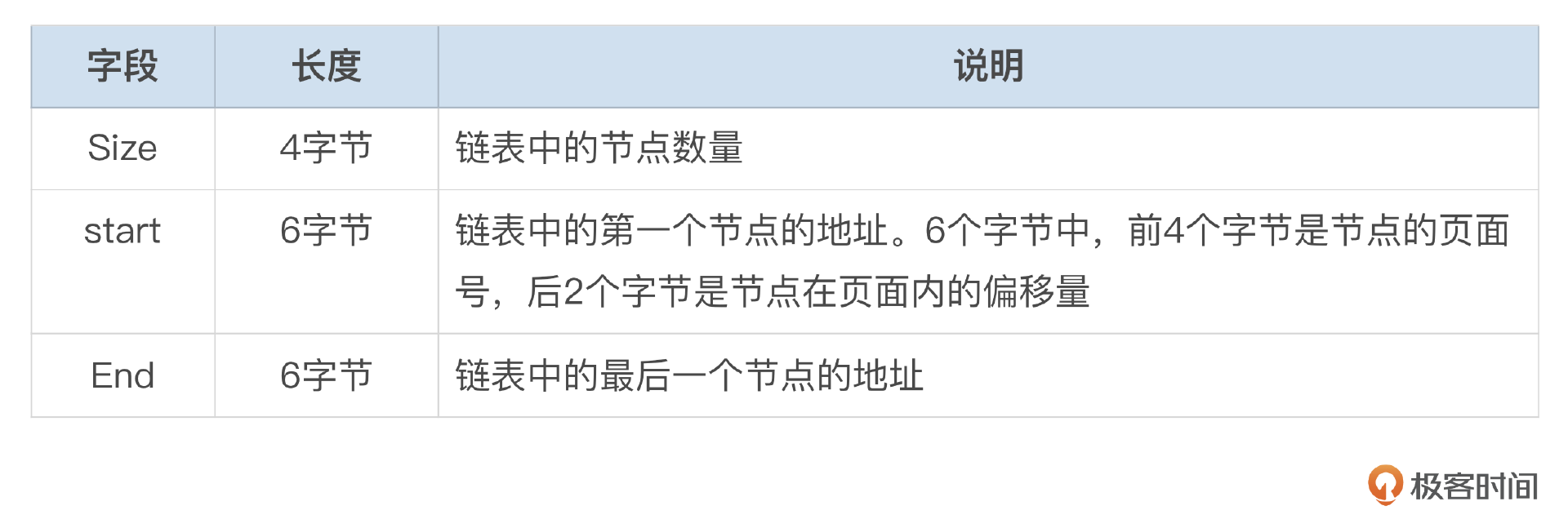 InnoDB的数据文件中存在大量双向链表结构,这些链表结构上是一样的,都由链表基节点和链表节点组成。链表基节占用16字节,由下面这3个字段组成。