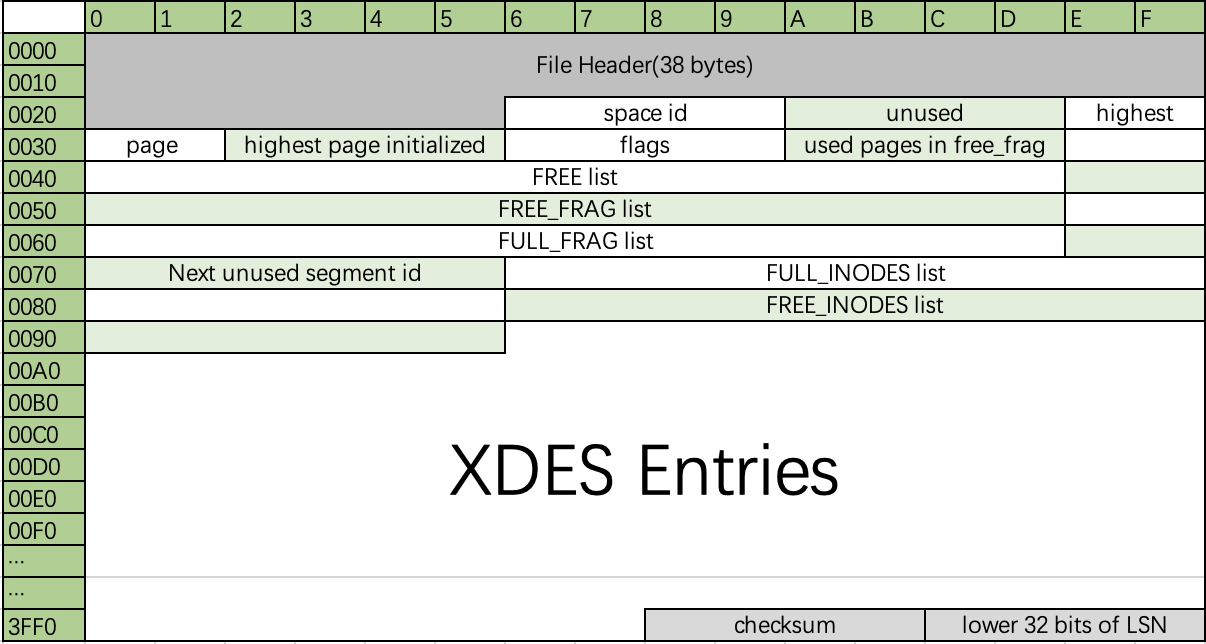 表空间文件分为3个区域,FSP Header中的highest page initialized和highest page字段分别记录已初始化空间和未初始化空间的最大页面编号。
