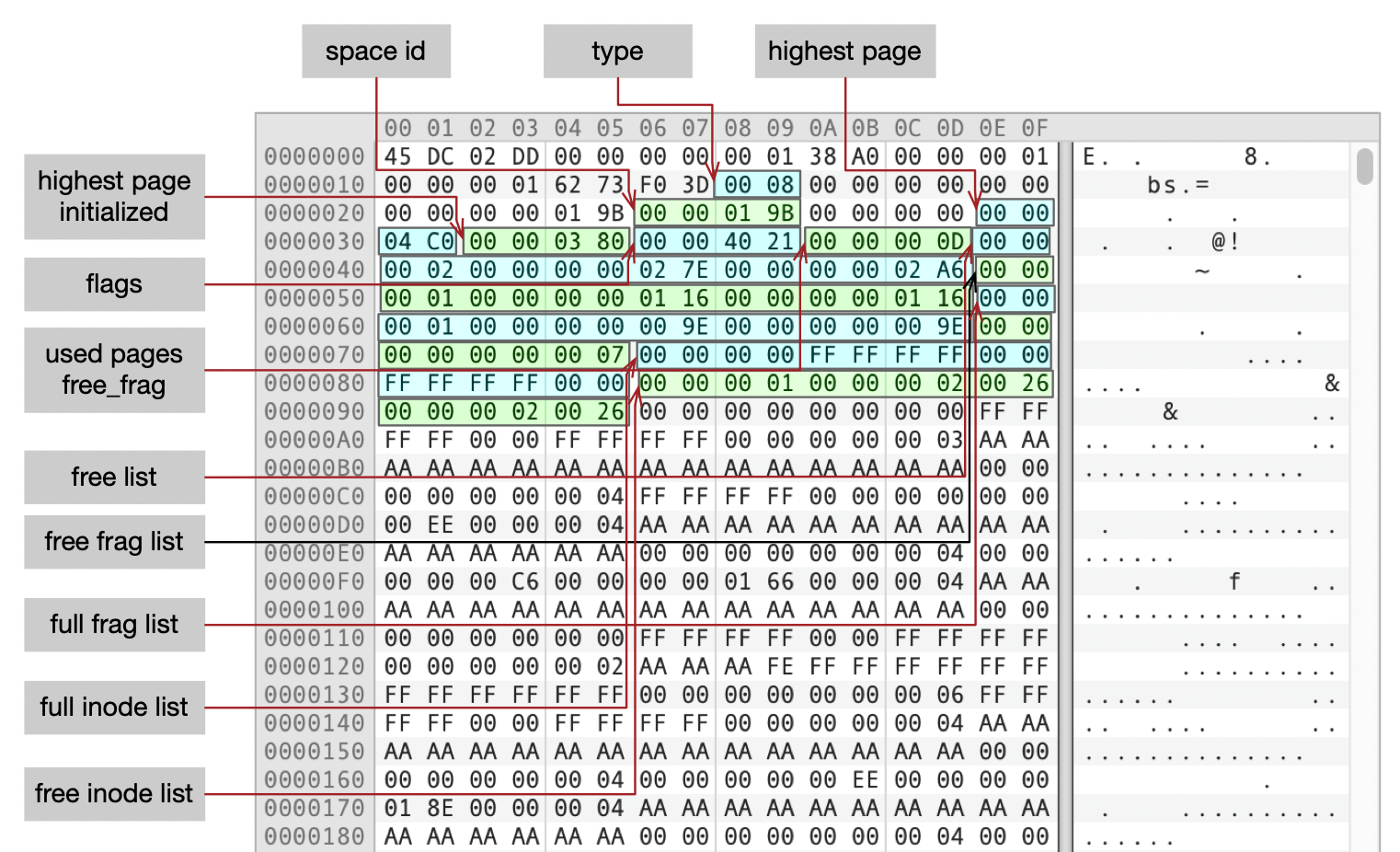 InnoDB使用段来管理空间,段描述符(inode)记录了段的相关信息,inode中的信息我整理到了下面这个表格中。