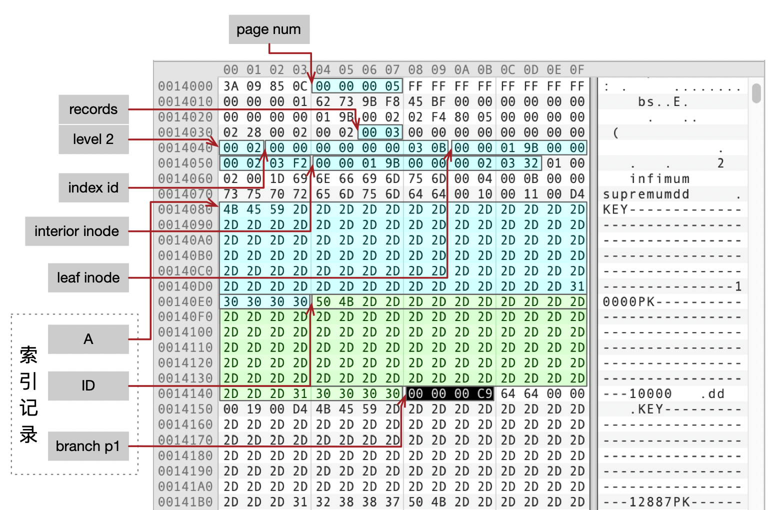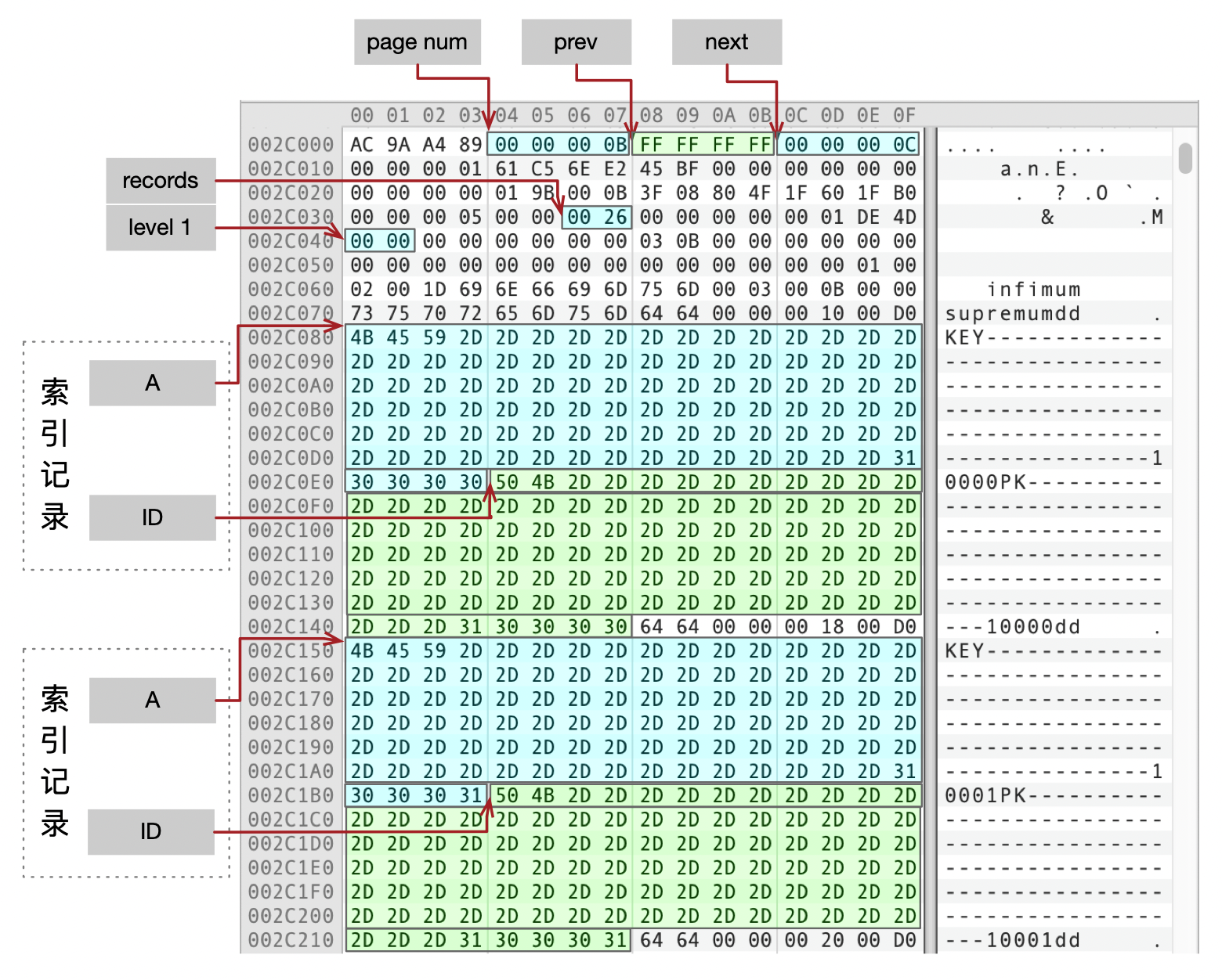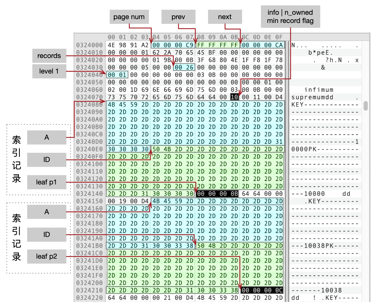 - 索引记录由字段A、ID和指向叶子页面的编号组成。图中显示了两条索引记录,分别是(KEY-10000,PK-10000,Page 0B)和(KEY-10038,PK-10038,Page 0C)。