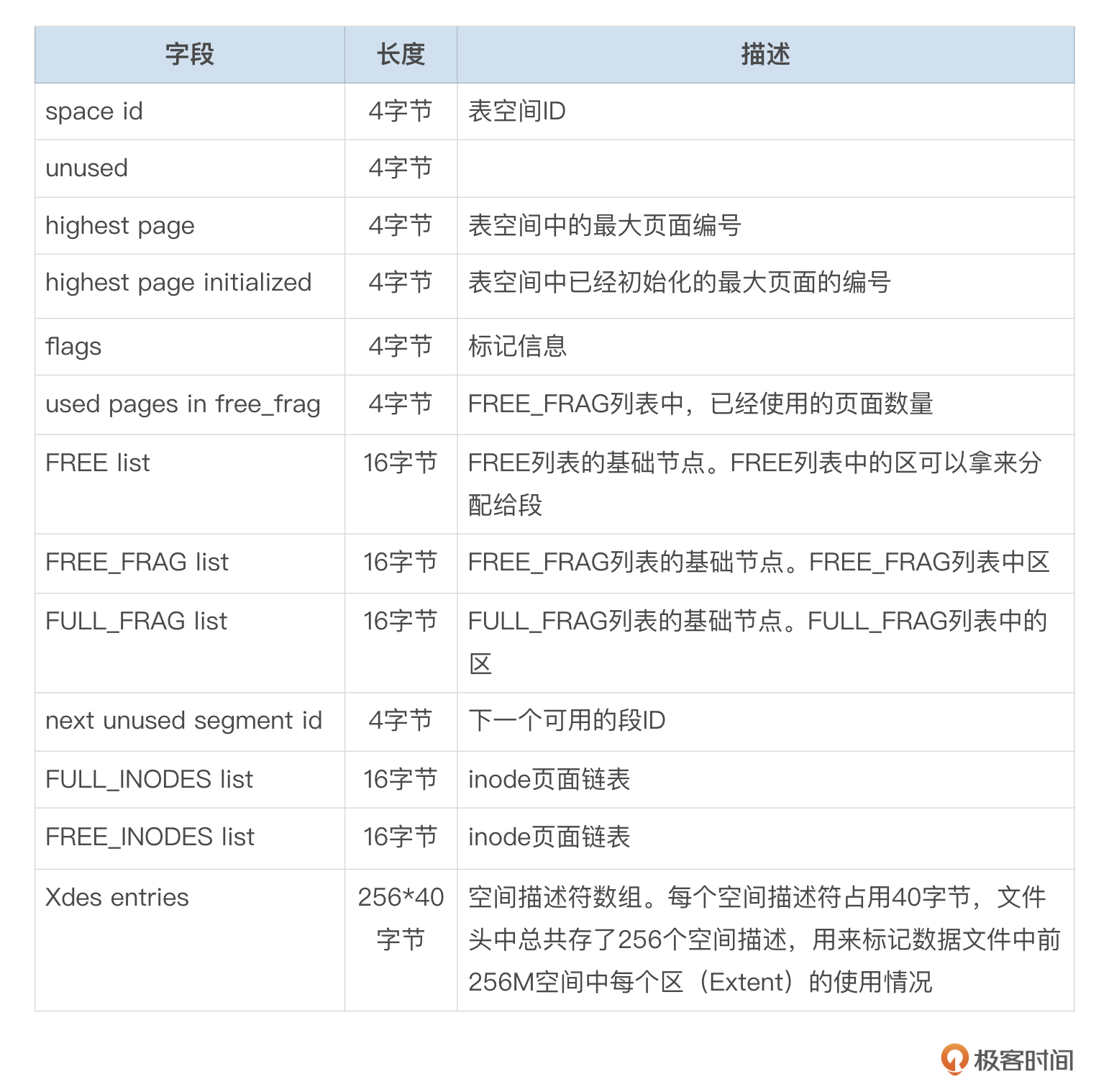 数据文件的第一个页面称为文件头(FSP Header),里面存储了整个表空间的相关信息。文件头的具体存储格式,可以参考下面这个图和表格。