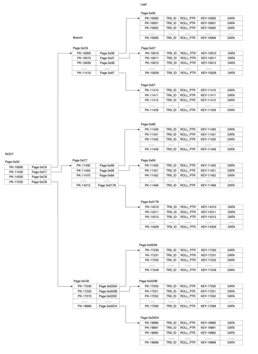 - 根页面中有4条索引记录,分别是(PK-10000,Page C6)、(PK-11430,Page C7)、(PK-14330,Page C8)、(PK-17230,Page CB)。