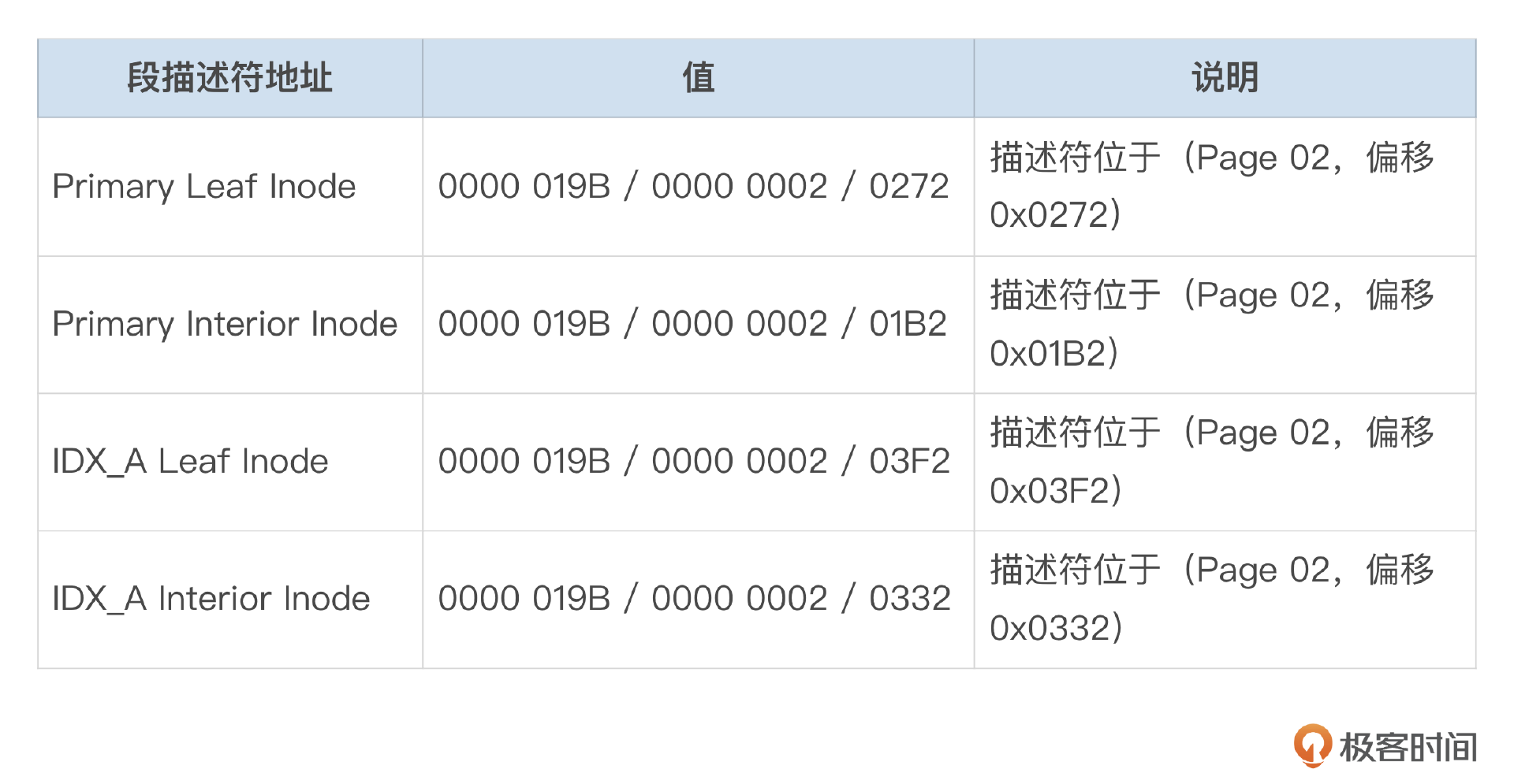InnoDB每个索引都由2个段(Segment)组成,在索引的根页面中,记录了这2个段的段描述符的地址。测试表t_btree的两个索引的段描述符地址我整理到了下面这个表格中。