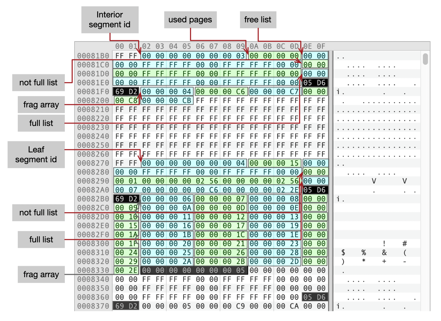 - leaf inode和interior inode分别记录了叶子页面和分支页面所在段(Segment)的段描述符(inode)的地址。inode的作用稍后再介绍。