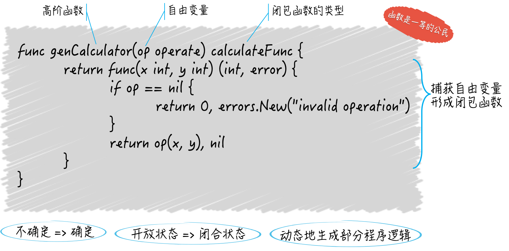 函数是Go语言支持函数式编程的主要体现。我们可以通过“把函数传给函数”以及“让函数返回函数”来编写高阶函数,也可以用高阶函数来实现闭包,并以此做到部分程序逻辑的动态生成。