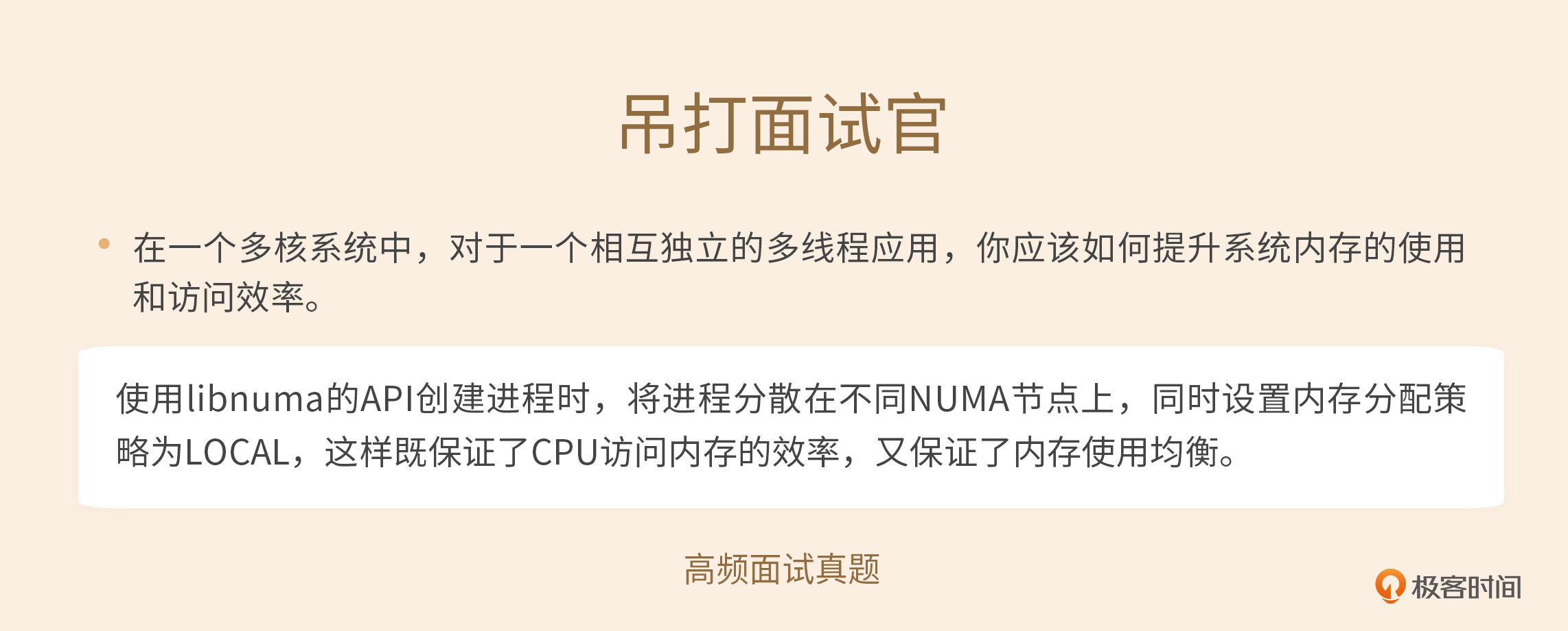 我们首先对NUMA的物理结构进行了介绍,了解到每个CPU都有自己专属的内存,访问自己的专属内存速度最快;虽然一个CPU也可以访问其他CPU的内存,但速度比较慢。