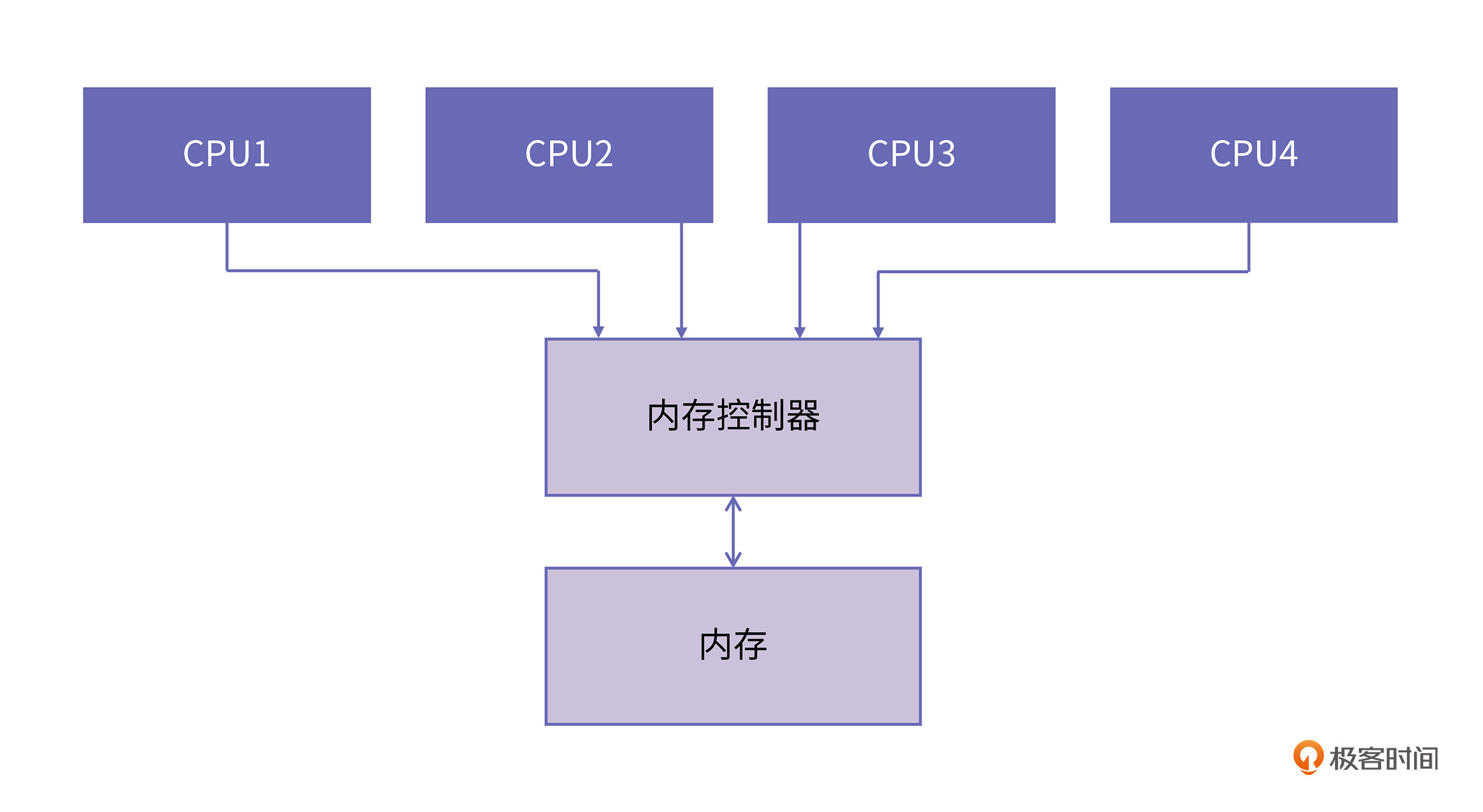 因为UMA是基于总线的,CPU需要先经过前端总线(Front Side Bus,FSB)连接到北桥,然后北桥再连接到内存控制器进行内存访问。如下图所示:
