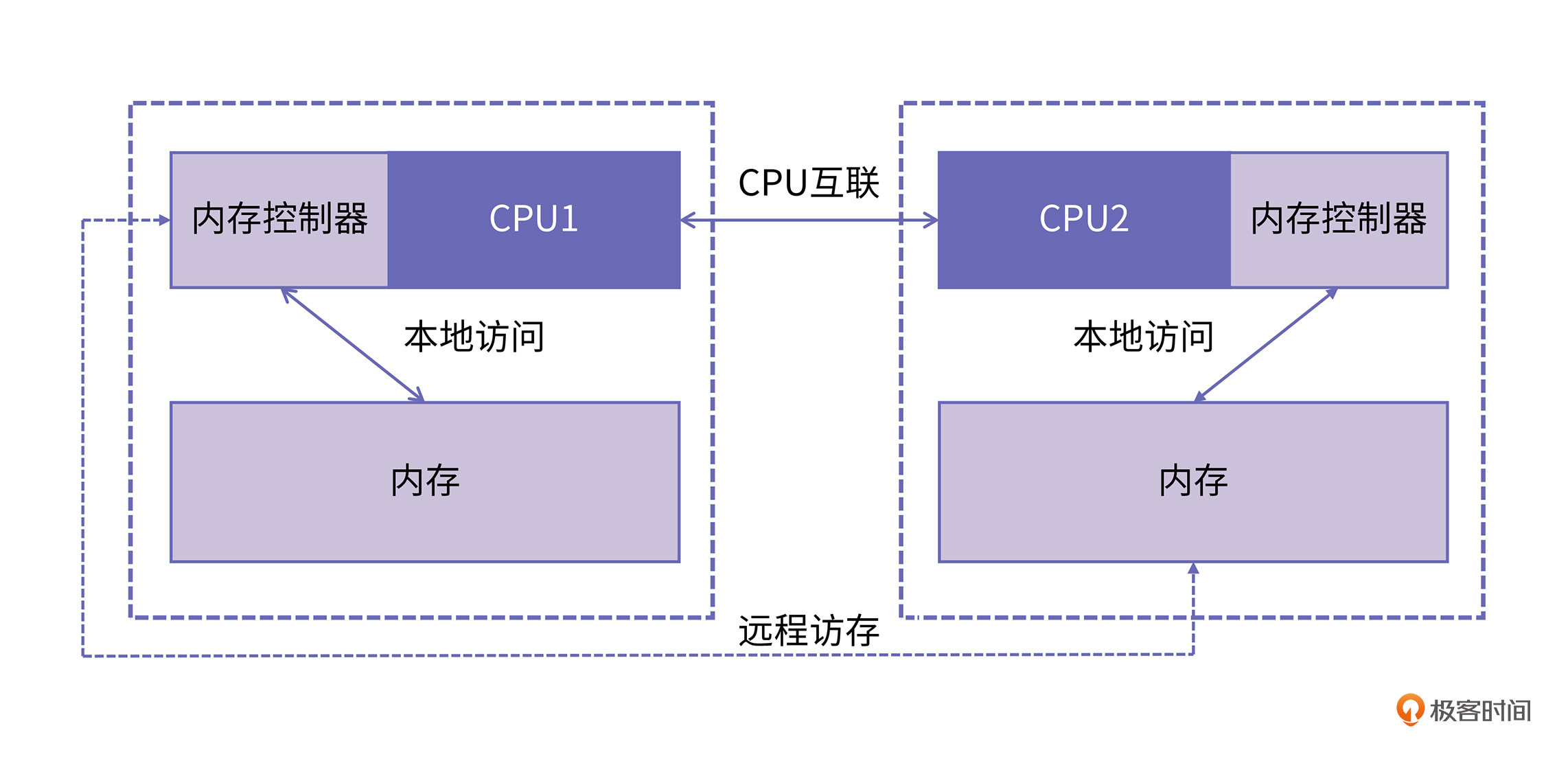 再往深入拆解,在异质式结构中,CPU不仅仅对外设内存和主存的访问速度不一样,它访问主存不同区间的速度也不一样。换句话说,不同的CPU访问不同地址主存的速度各不相同,我们把采用这种设计的内存叫做非一致性访存(Non-uniform memory access,NUMA)。