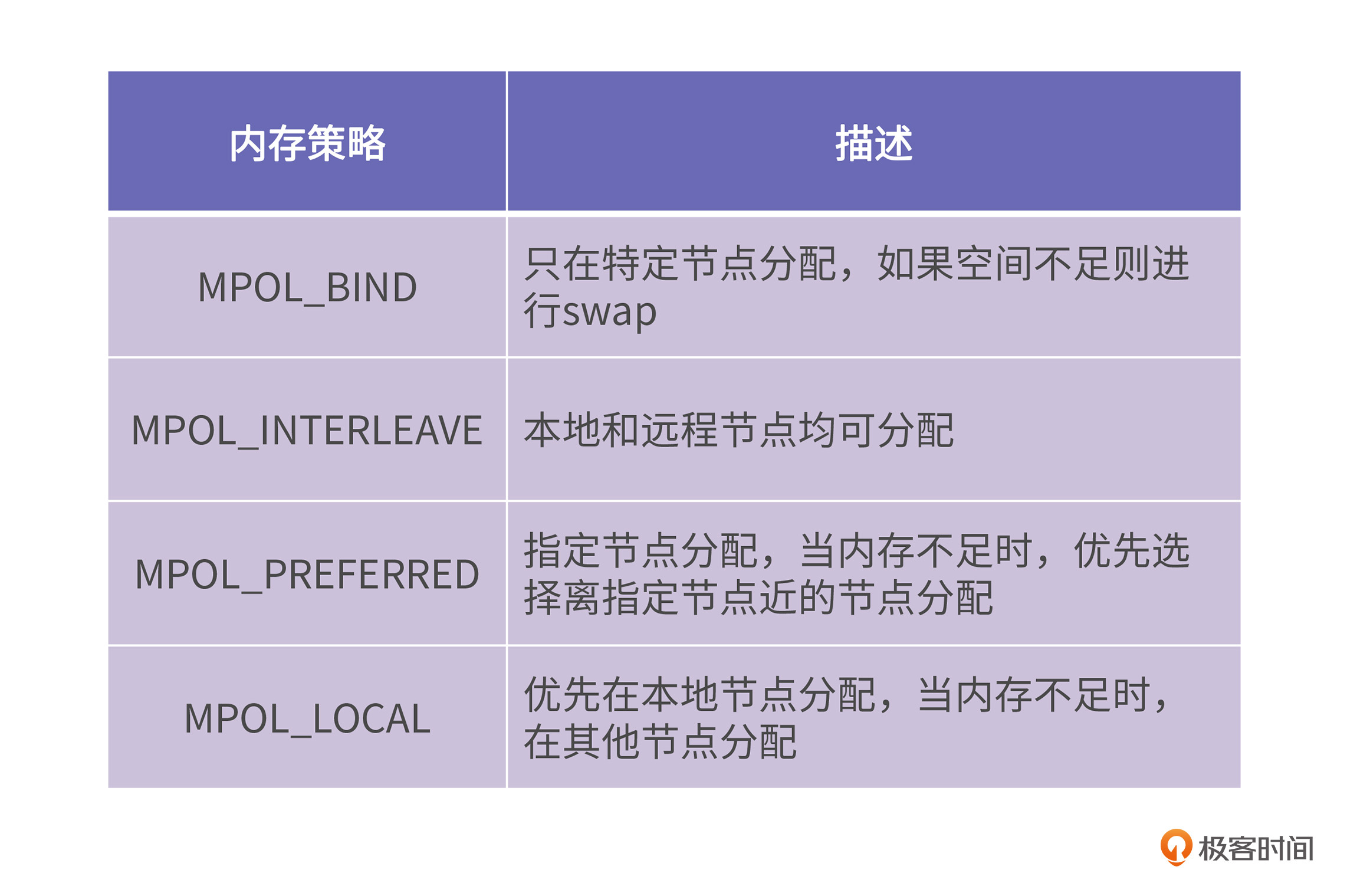 最后,我们讲到了NUMA上的内存策略,主要有四种: