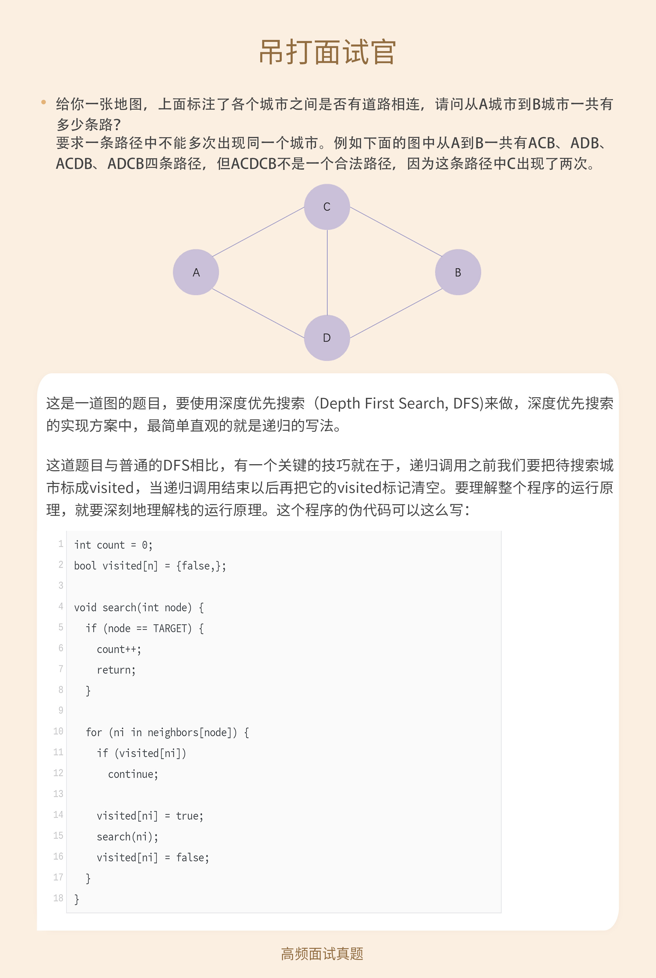 那么在这里呢,我还想让你做一个小练习。我想让你试着用我们上面分析栈变化的方法,来分析使用深度优先算法打印全排列的程序,这会让你更加深入地理解栈的运行规律,同时掌握深度优先算法的递归写法。
